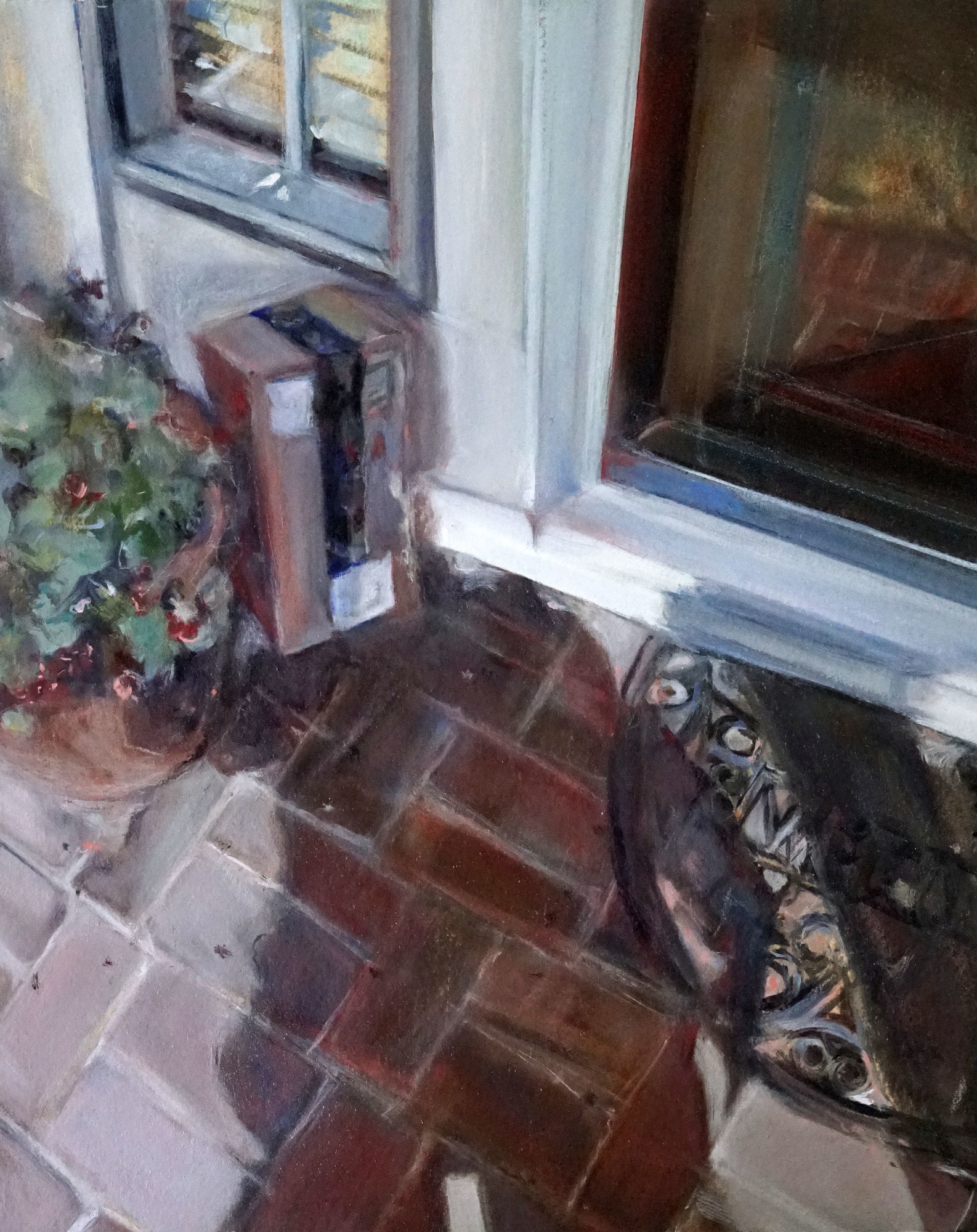 Evidence: oversized figure's shadow taking the photo, the photo distorting visually, a careening perspective with little breathing room. A commentary on the apparent ease of having stuff delivered to the door. The palette is Pacific Northwest Forest, light and shadow impartial. 1st of 11 in series