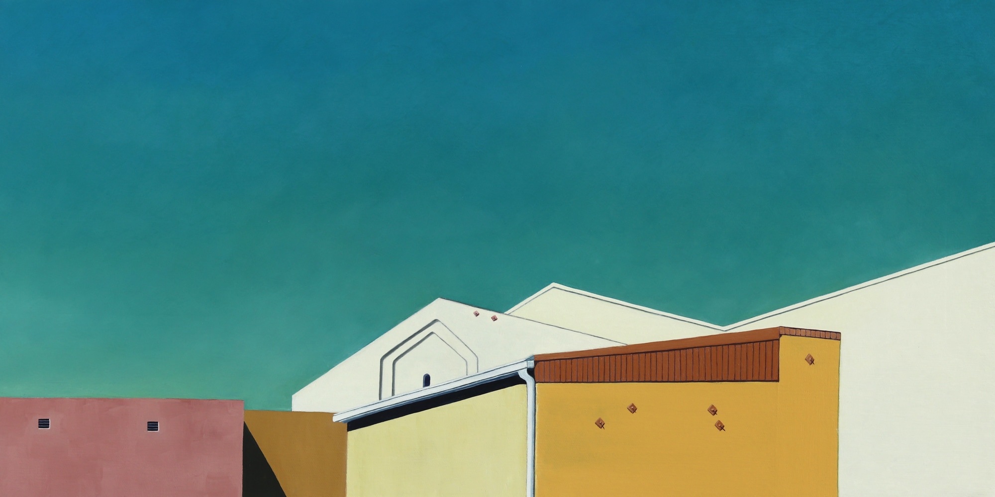 "Halcyon Days" is based on a reference photo I took years ago (in the "before times") from the window of my yoga studio, harkening back to a time and place where I found grounding. My color palette is inspired by Diebenkorn's Ocean Park series and the simplified geometric shapes reflect the magical Los Angeles light that so often catches my attention. Painting this during the pandemic, with an appreciation for little moments around me, brought me joy.
