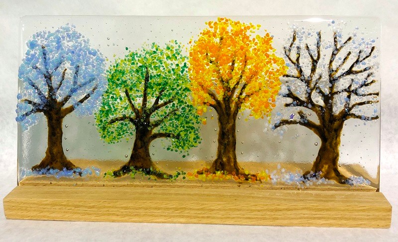 On a clear base, oak like trunks in powder and with med frit making leaves in 4 season colors (blue spring). Display in oak wood stand.