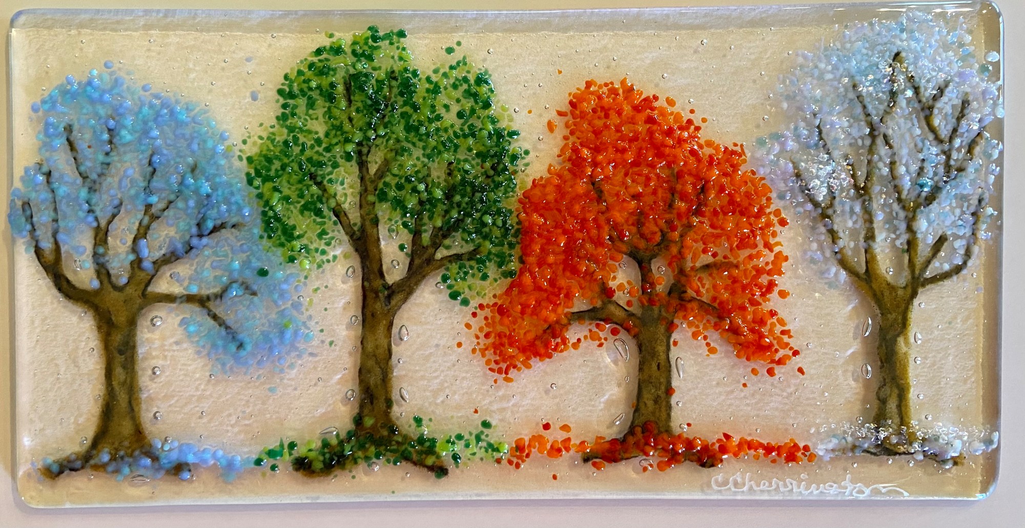 On a clear base, oak like trunks in powdered glass and with med frit making leaves in 4 season colors. Display in wood stand. Spring is blue, Fall is red orange.