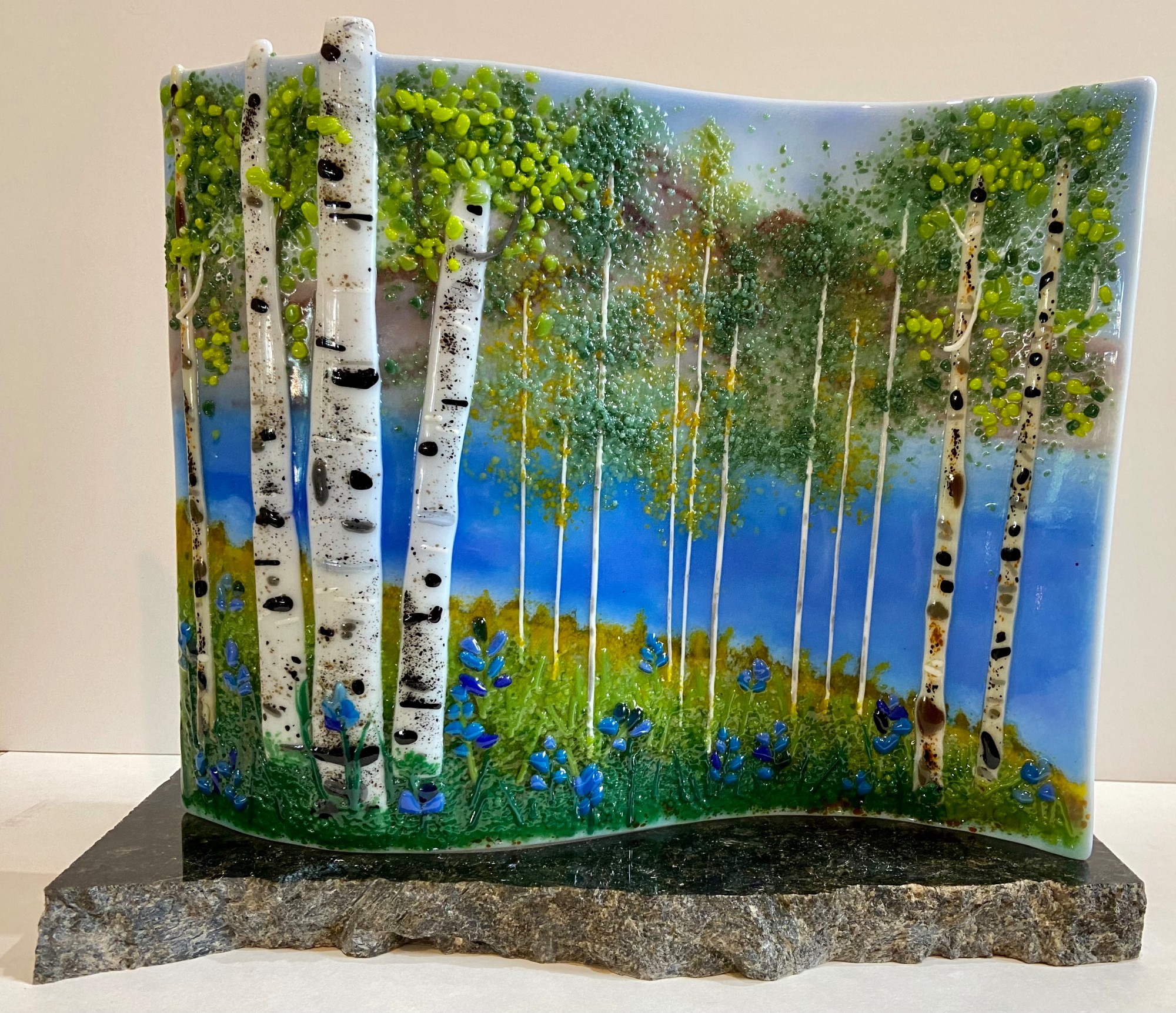 A serene day in the summer with a lake and crisp white aspens (or birch). Created with crushed glass bits (frit), powders and cut pieces. Layered and fired several times to create depth. Free standing on a black granite base.
