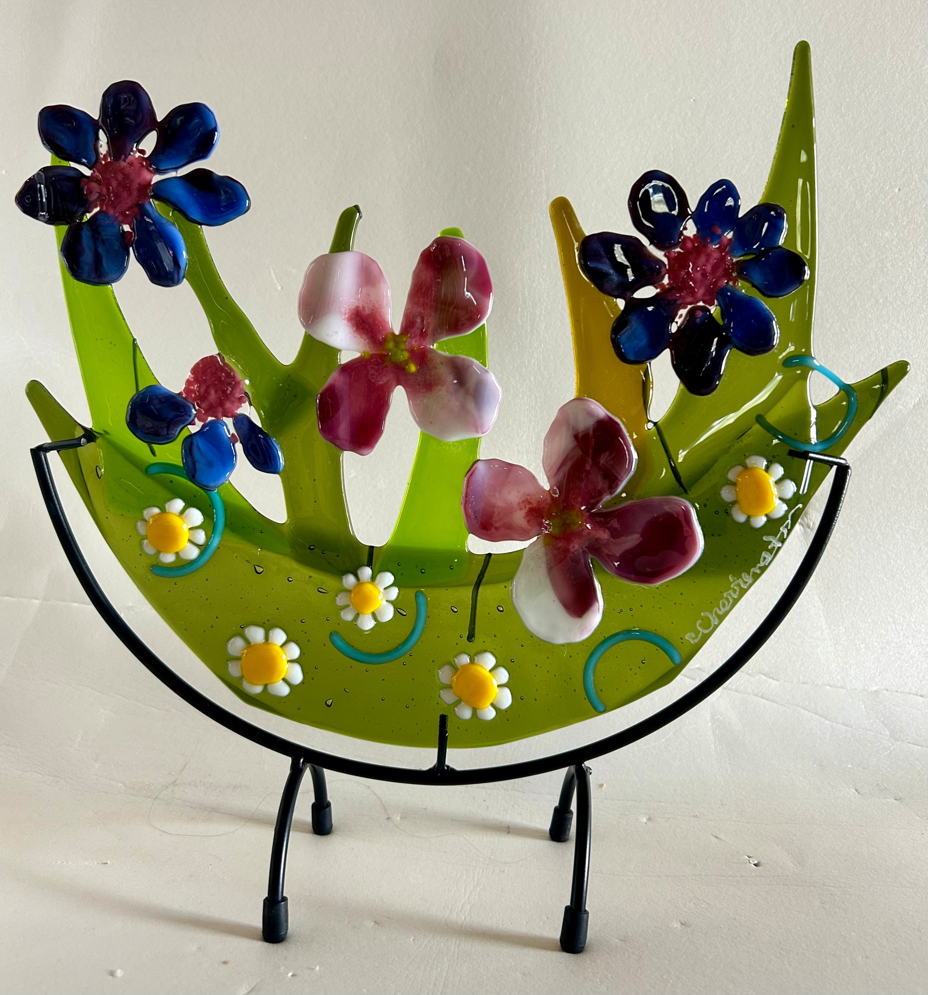 On a half circle of clear glass grows green grass with colorful a mix of wild flowers. Display in black metal stand.