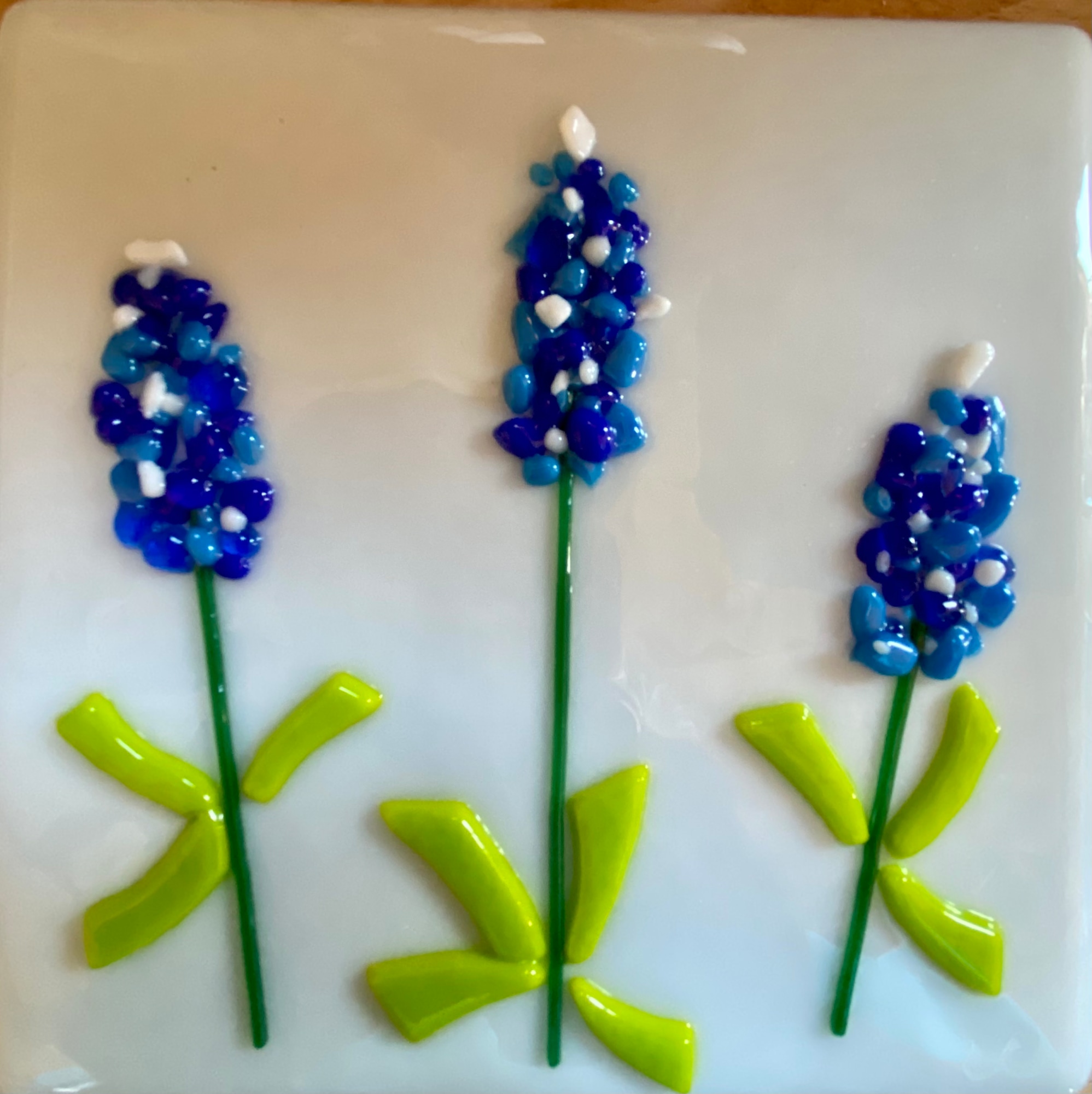 Tack fused Bluebonnets on white background. Glass is mounted on painted wood. Ready to hang.