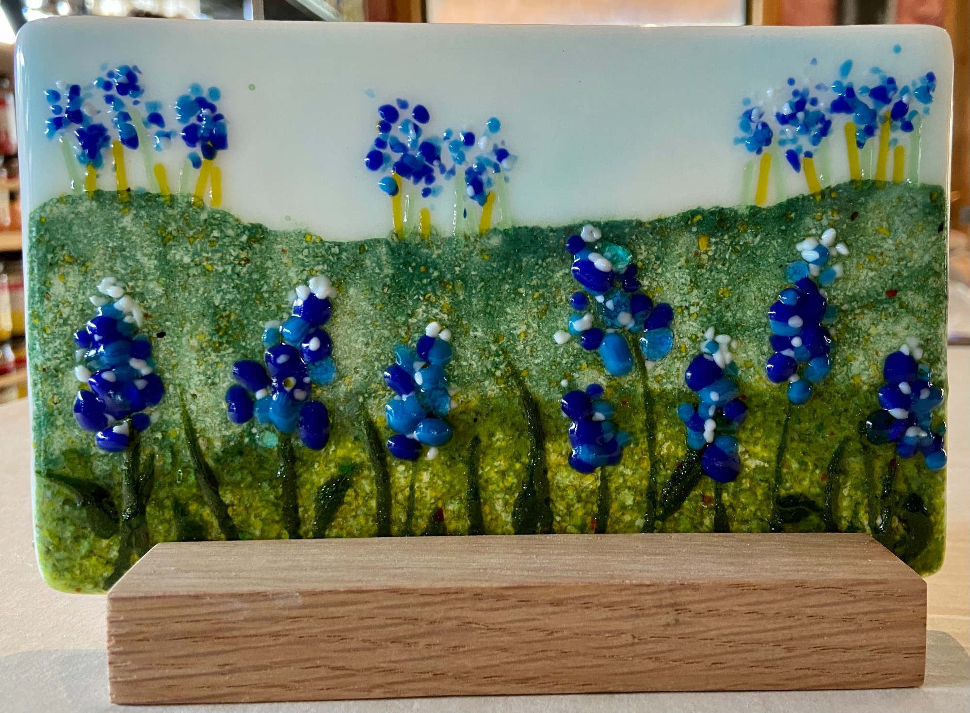 Lots of powdered and crushed glass frit are used to create these small but beautiful field of bluebonnets. Sits on a wood stand for display.
