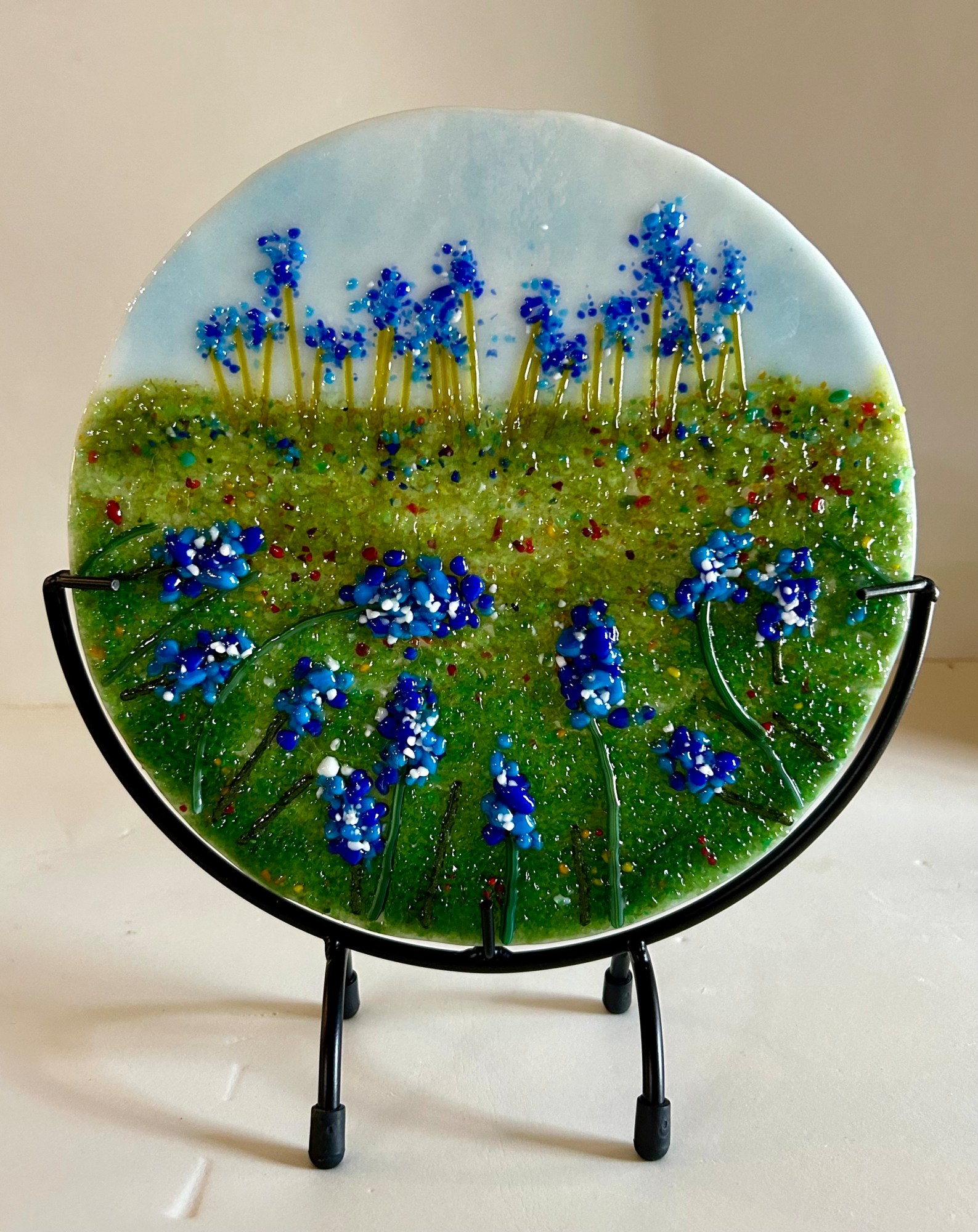 A field of bluebonnets that go on forever. Table top display in a black metal stand.