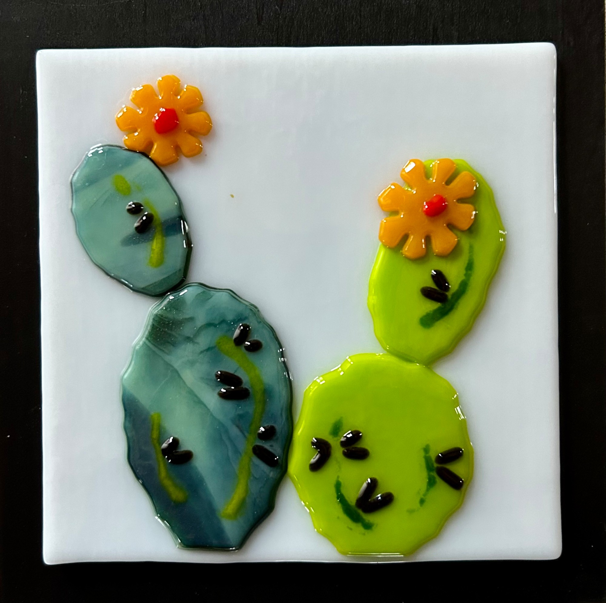 Green cactus in bloom. Mounted on a painted black board and ready to hang.