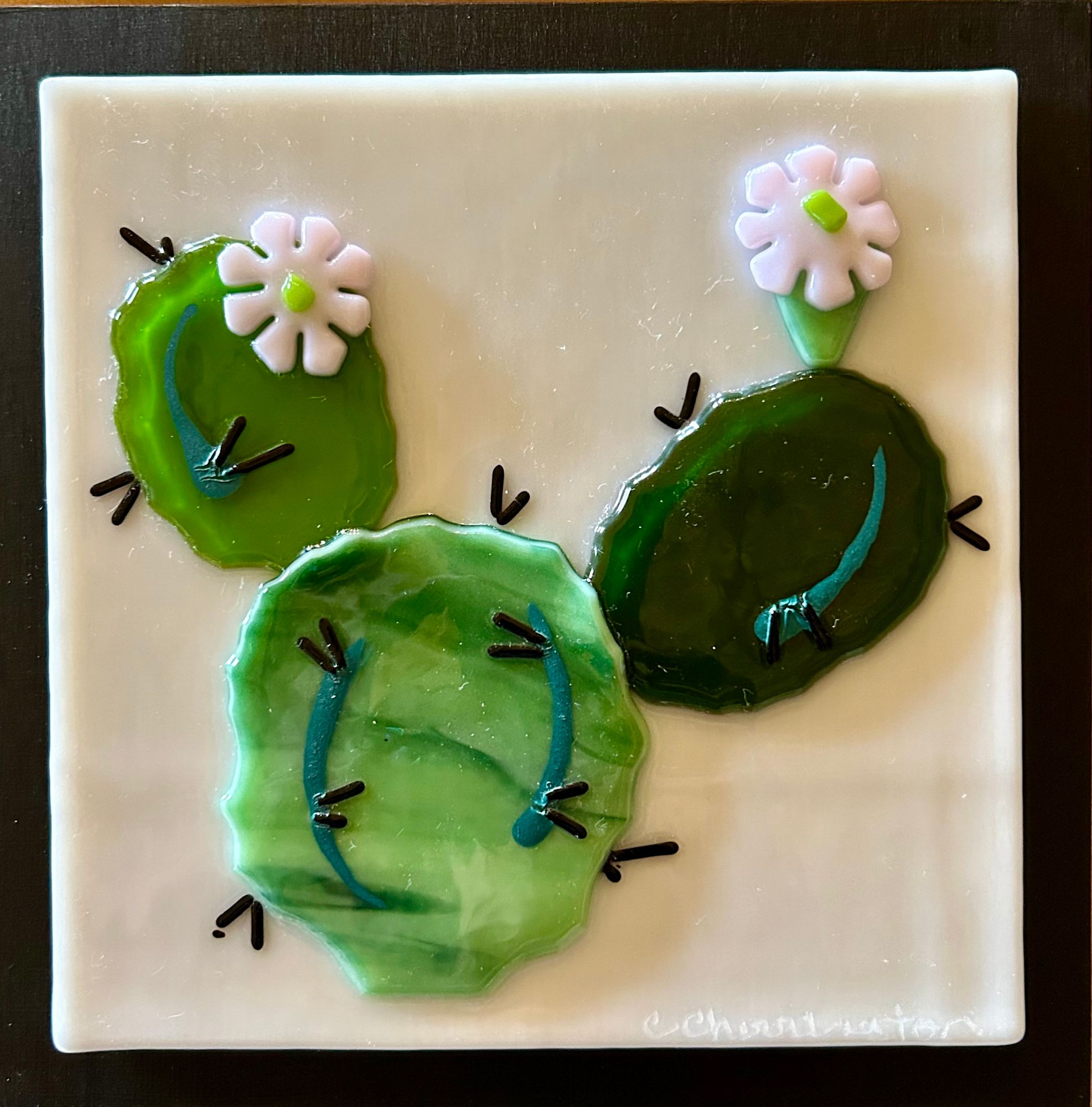 Bright green cactus blooming. Display on painted panel and wired to hang.