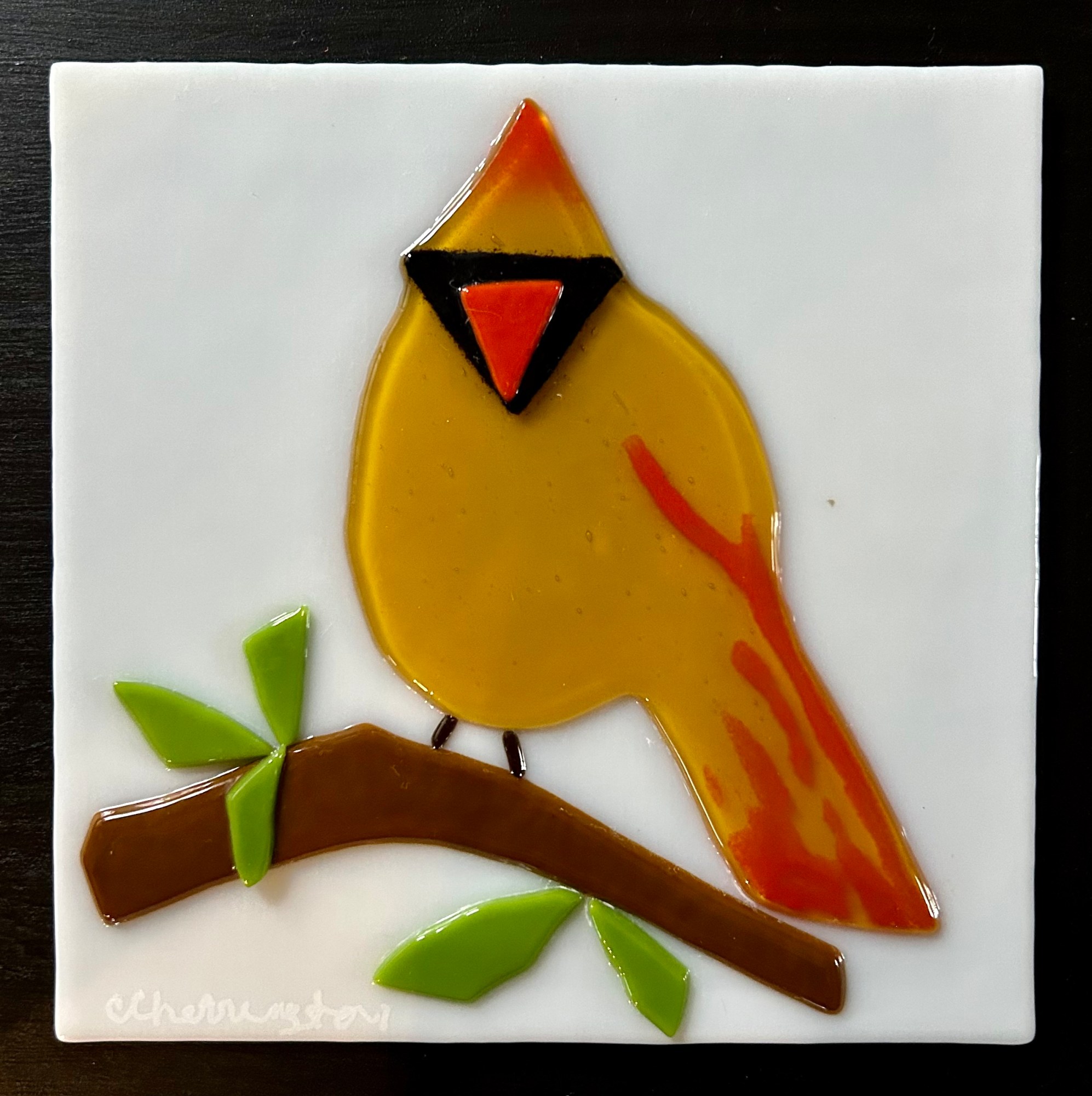 A cardinal on a branch. Mounted on a painted black board and ready to hang.