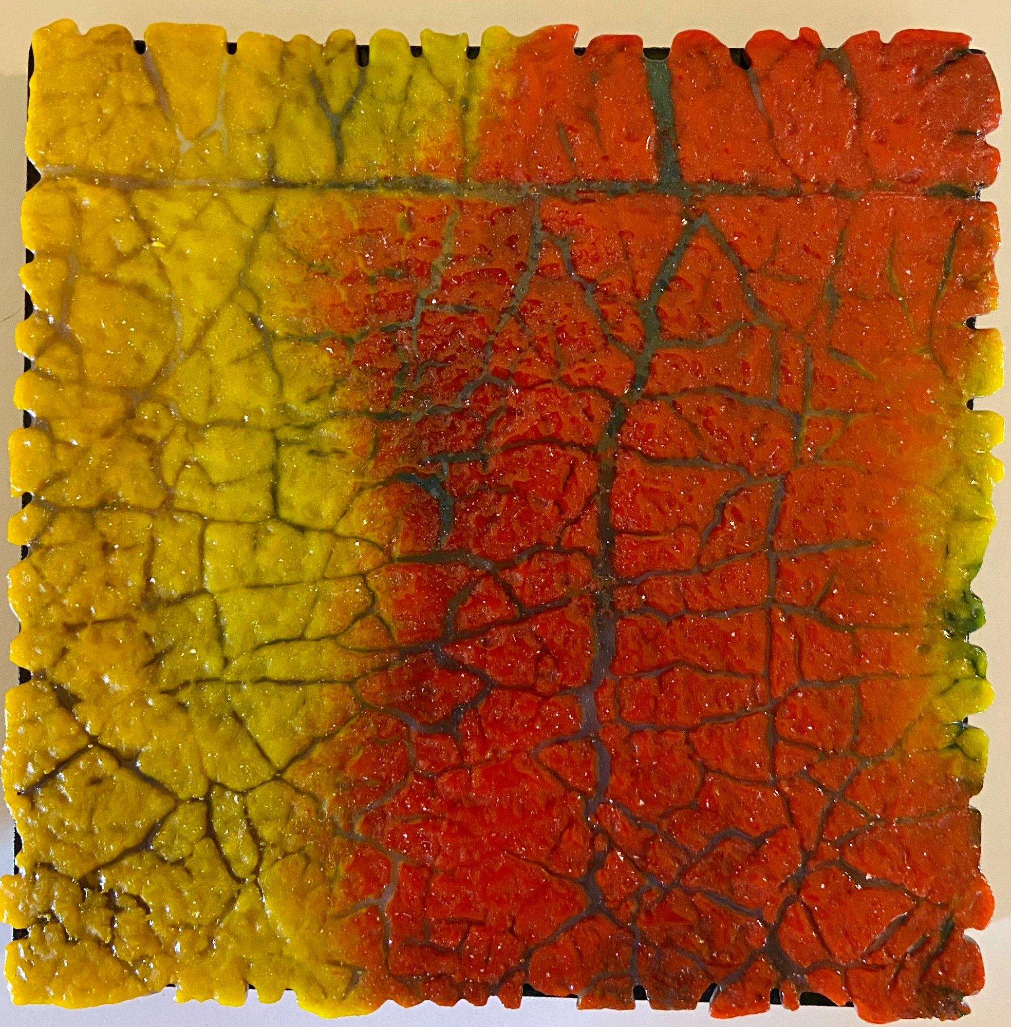 Glass frit made into paste and layered on with a pallet knife. Mounted to black board and ready to hang.