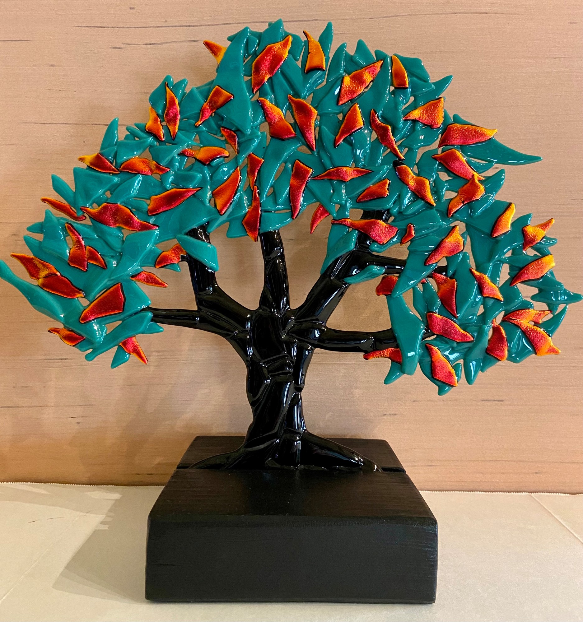 Teal opaque with dichroic cherry apply red on black glass create the foliage on this black glass based tree. Display table top in black wood stand.