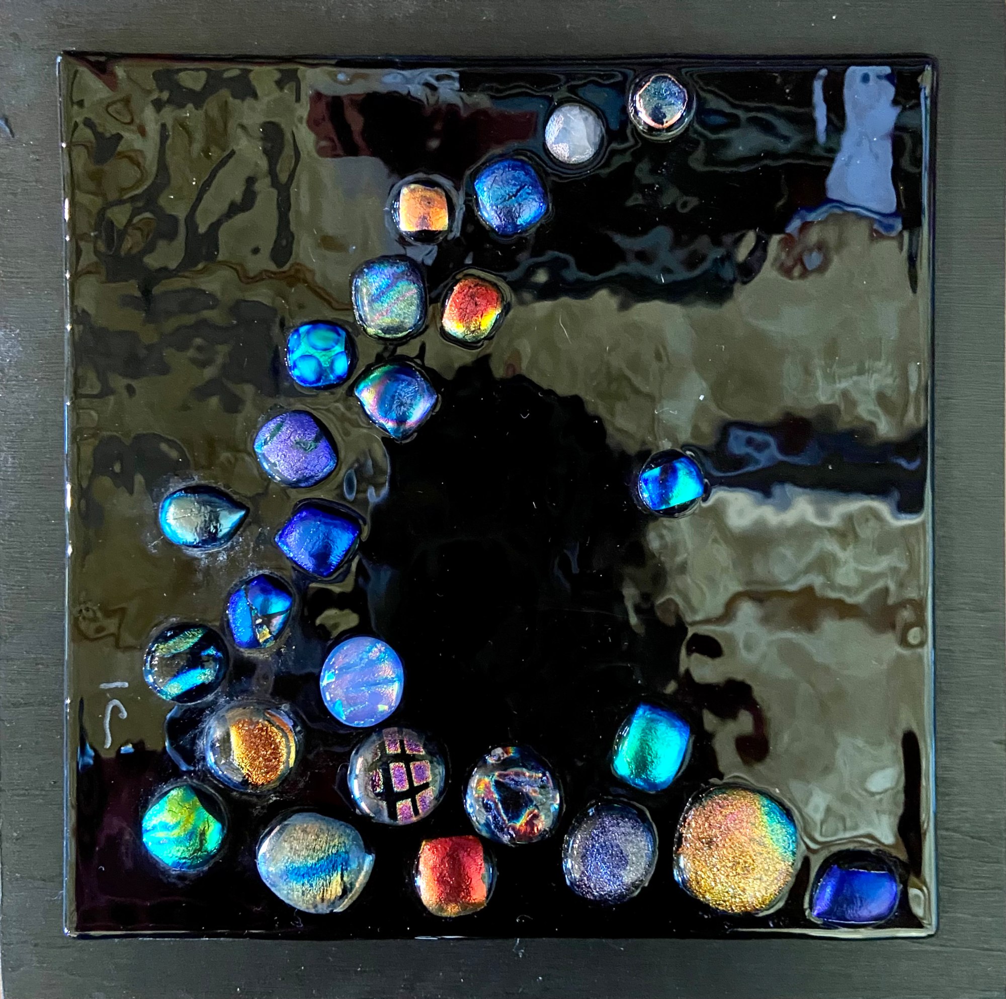 A variety of dichroic dots on a field of black. Mounted on a painted black board and ready to hang.
