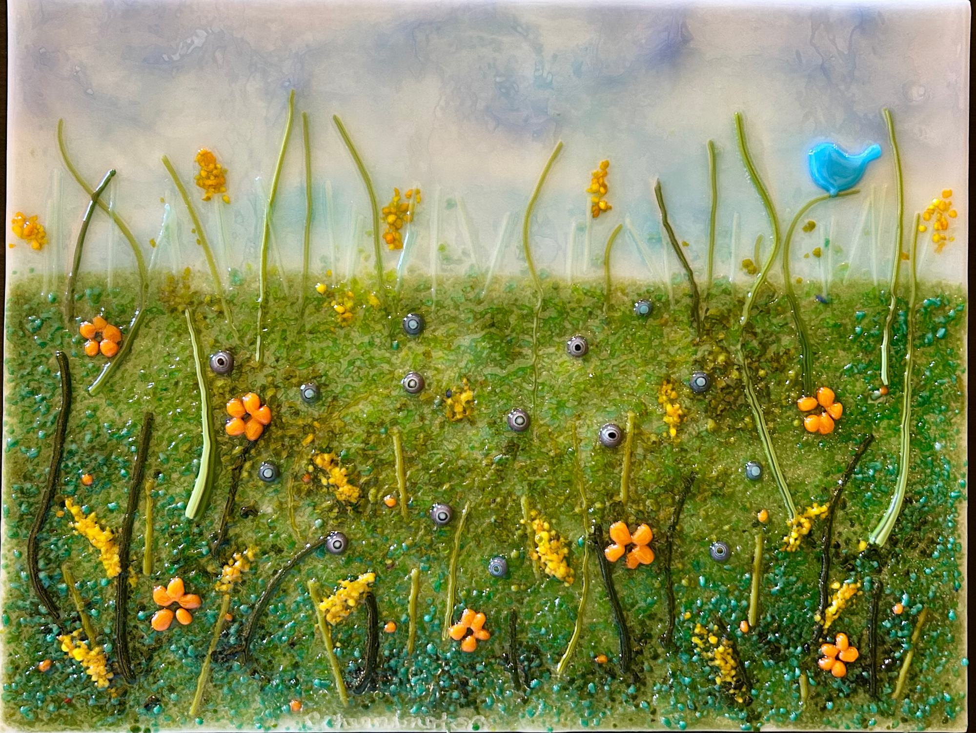 A bluebird enjoys a beautiful spring day, flowers bloom wild in a field. Mounted on a wood panel and ready to hang.
