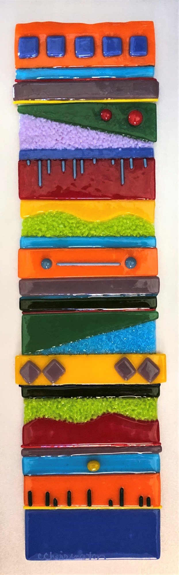 Multiple glass colors in transparents and opaques create this tall totem. Mounted on brushed aluminum ready to hang.