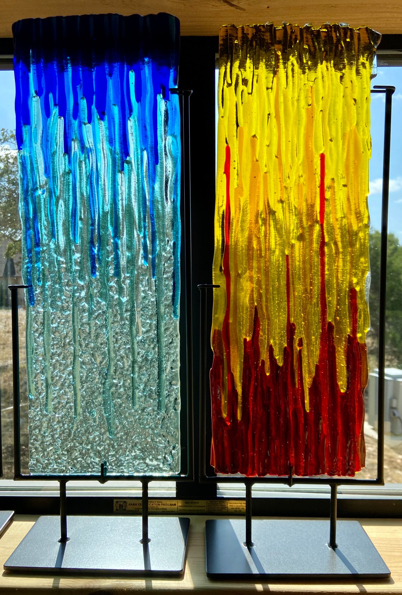 Transparent glasses standing on edge then fired in a kiln. Display on custom metal stand.