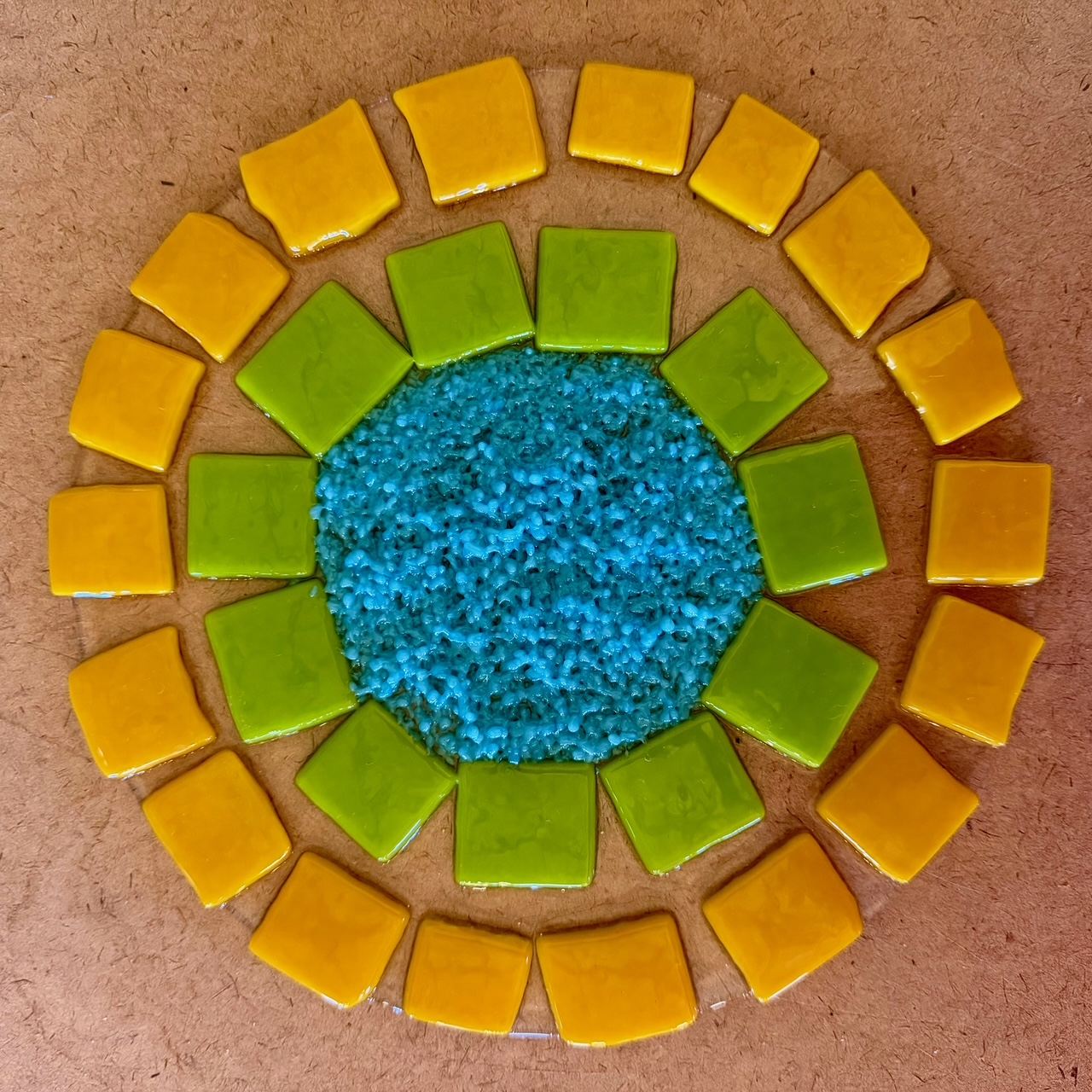 Colorful disc mounted to a rubber puck to insert garden stake.