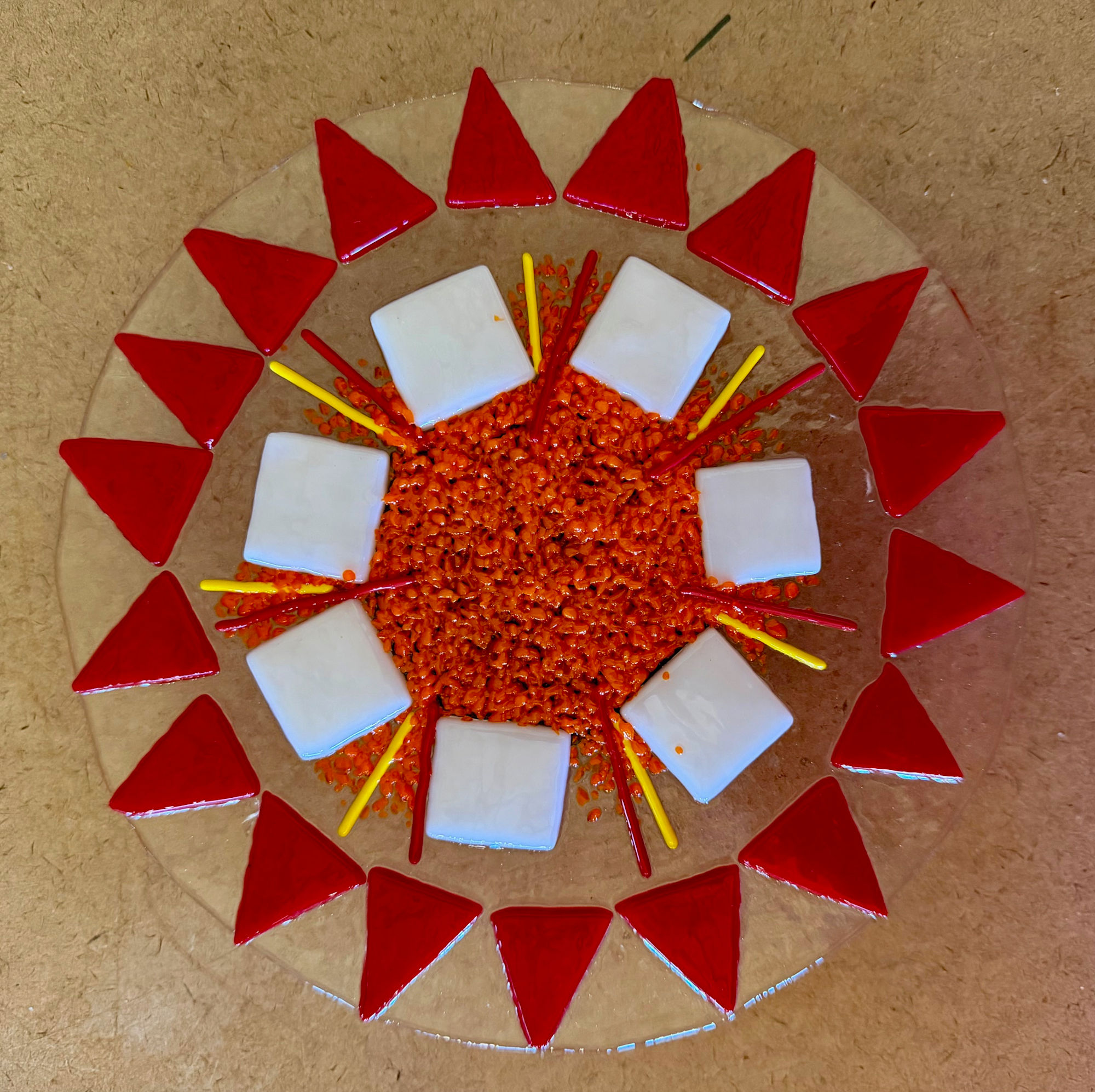 Colorful disc mounted to a rubber puck to insert garden stake.