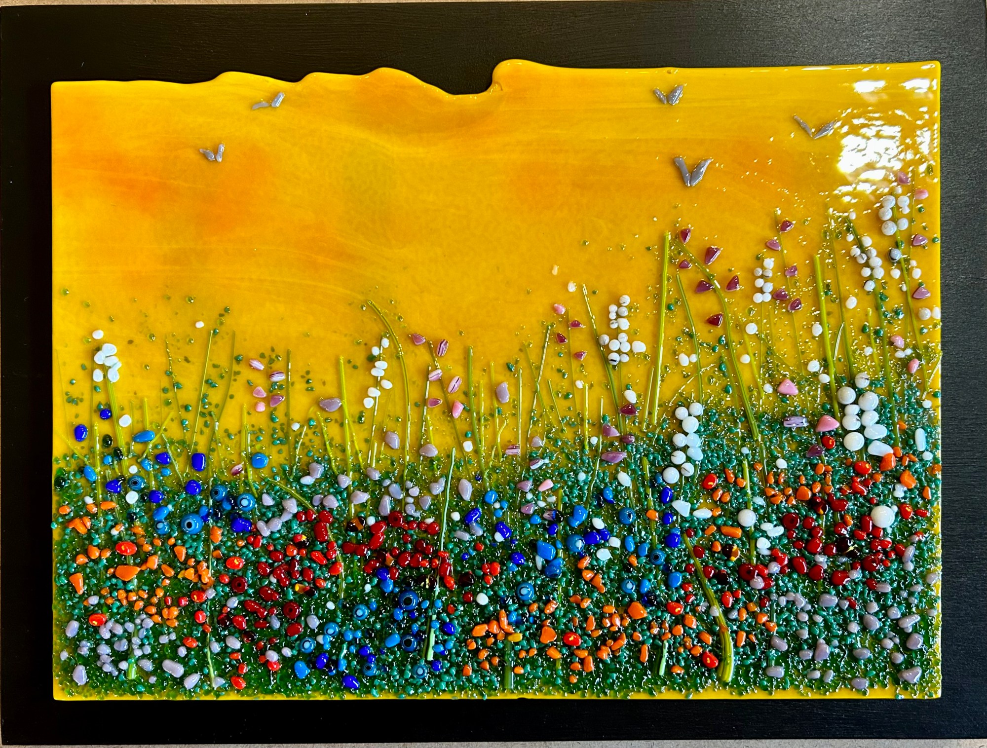 Under a gold sun lite sky, this field is blooming with vivid colorful wildflowers. Mounted on a black board and ready to hang.