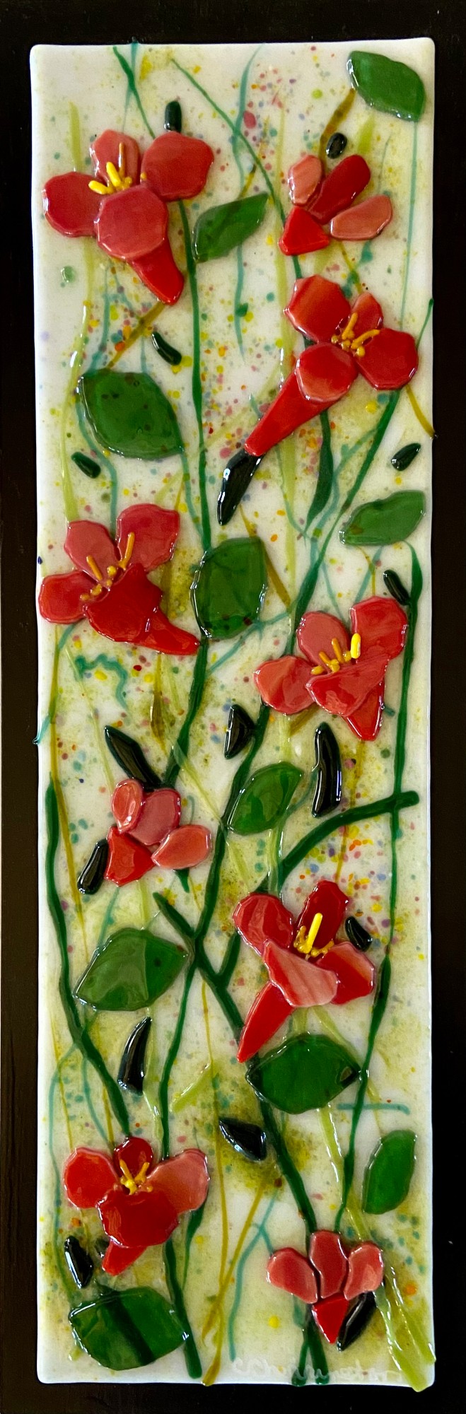 A blended red glass cut into the shape of Morning Glories blooming on the vine. Mounted on painted aluminum.