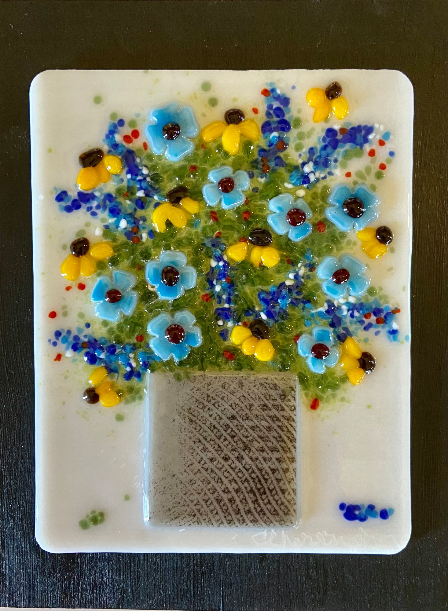 A glass arrangement of baby blue flowers and black-eyed susans. Mounted on wood board and ready to hang.