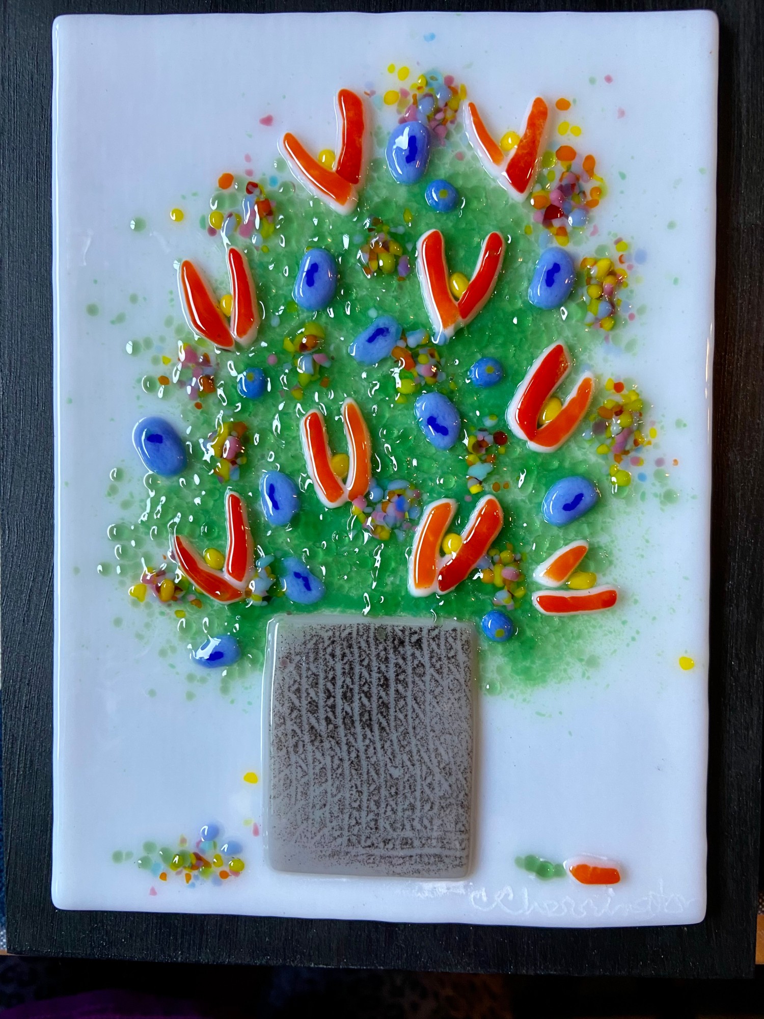 Created with crushed glass bits (frit) and powders. Each flower formed by hand using tweezers to place bits of glass together to form a flower. Layered and fired several times to create depth. Framed and ready to hang.