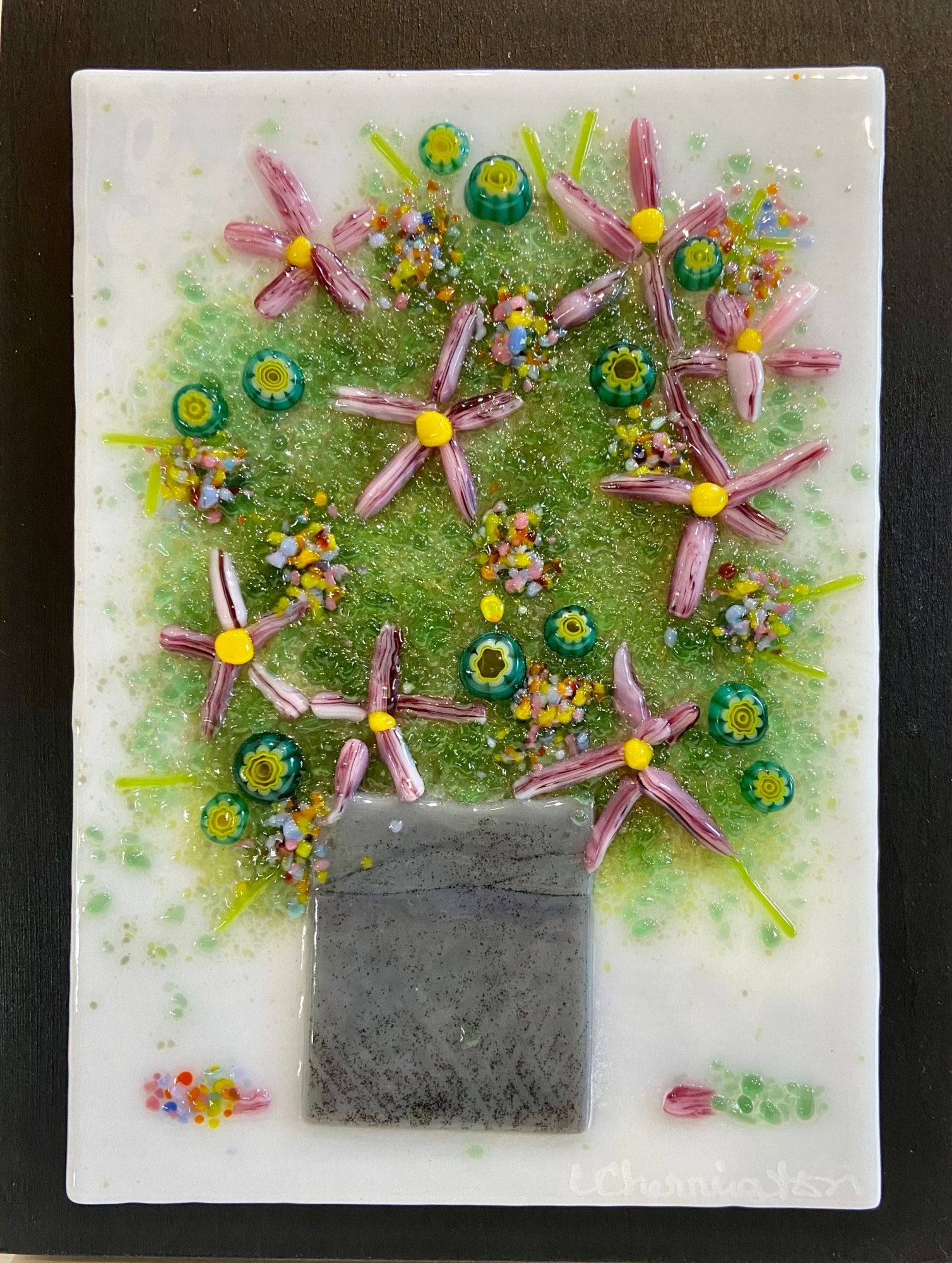 Glass bits arranged as flowers in a vase. Mounted on wood. Display hanging.