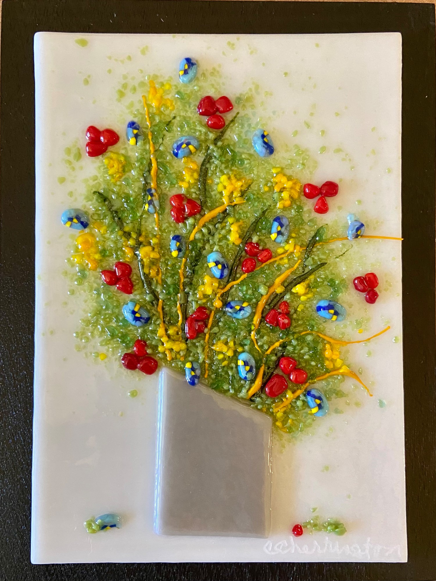Glass bits arranged as flowers in a vase. Mounted on wood. Display hanging.