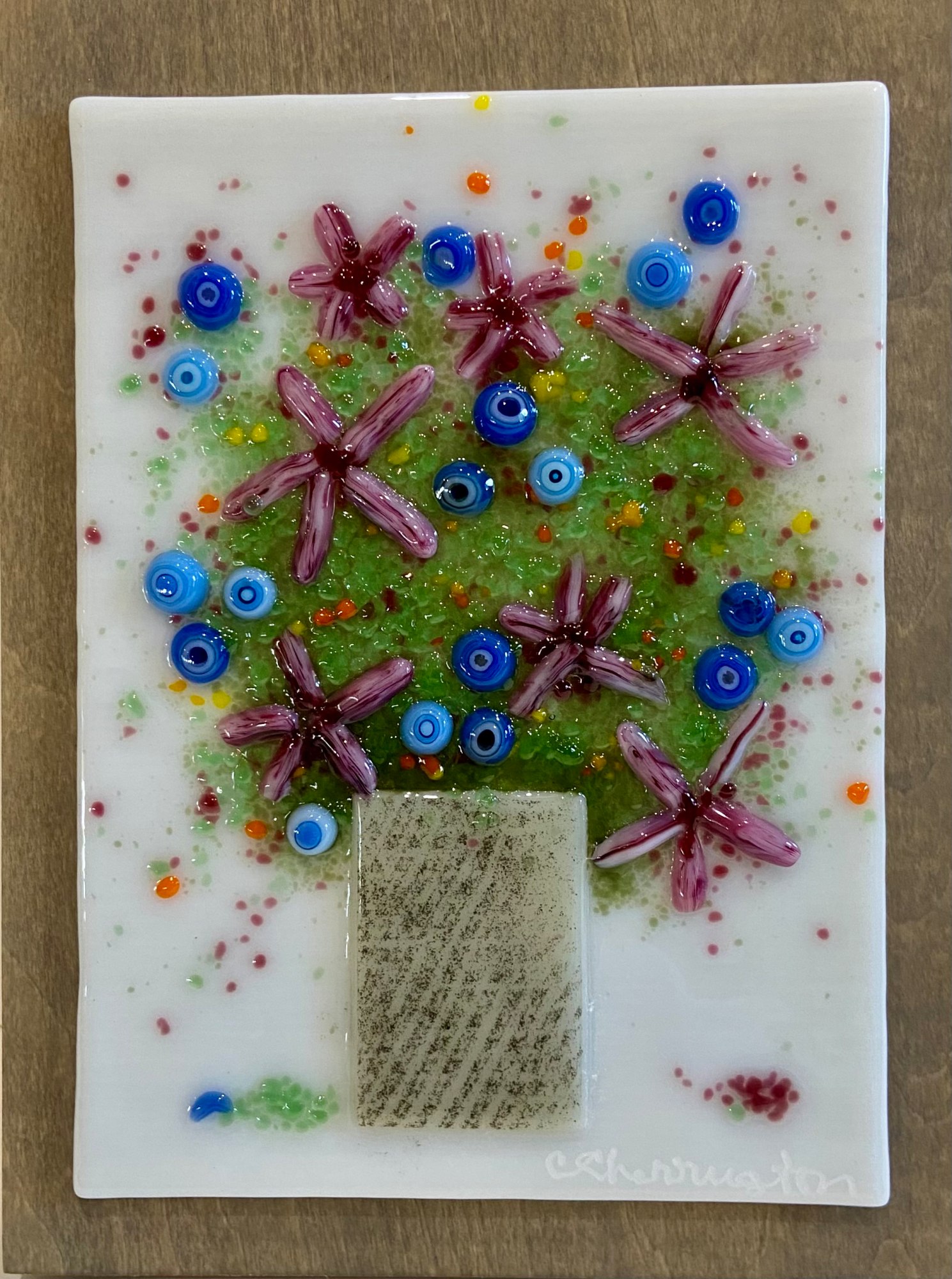 Glass bits arranged as flowers in a vase. Mounted on wood. Display hanging.