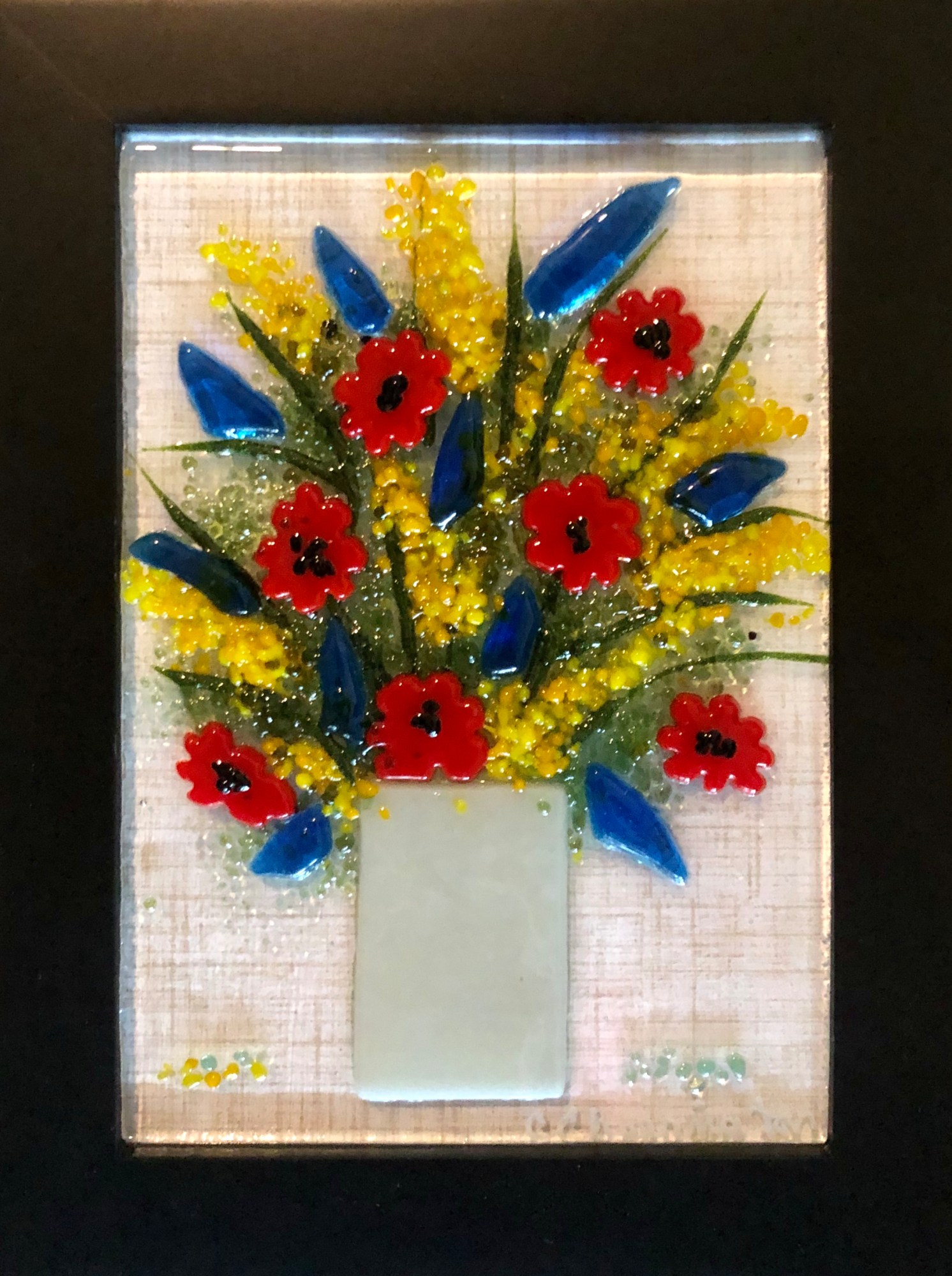 Glass bits arranged as flowers in a vase. Mounted in wood frame. Display table top or hanging.