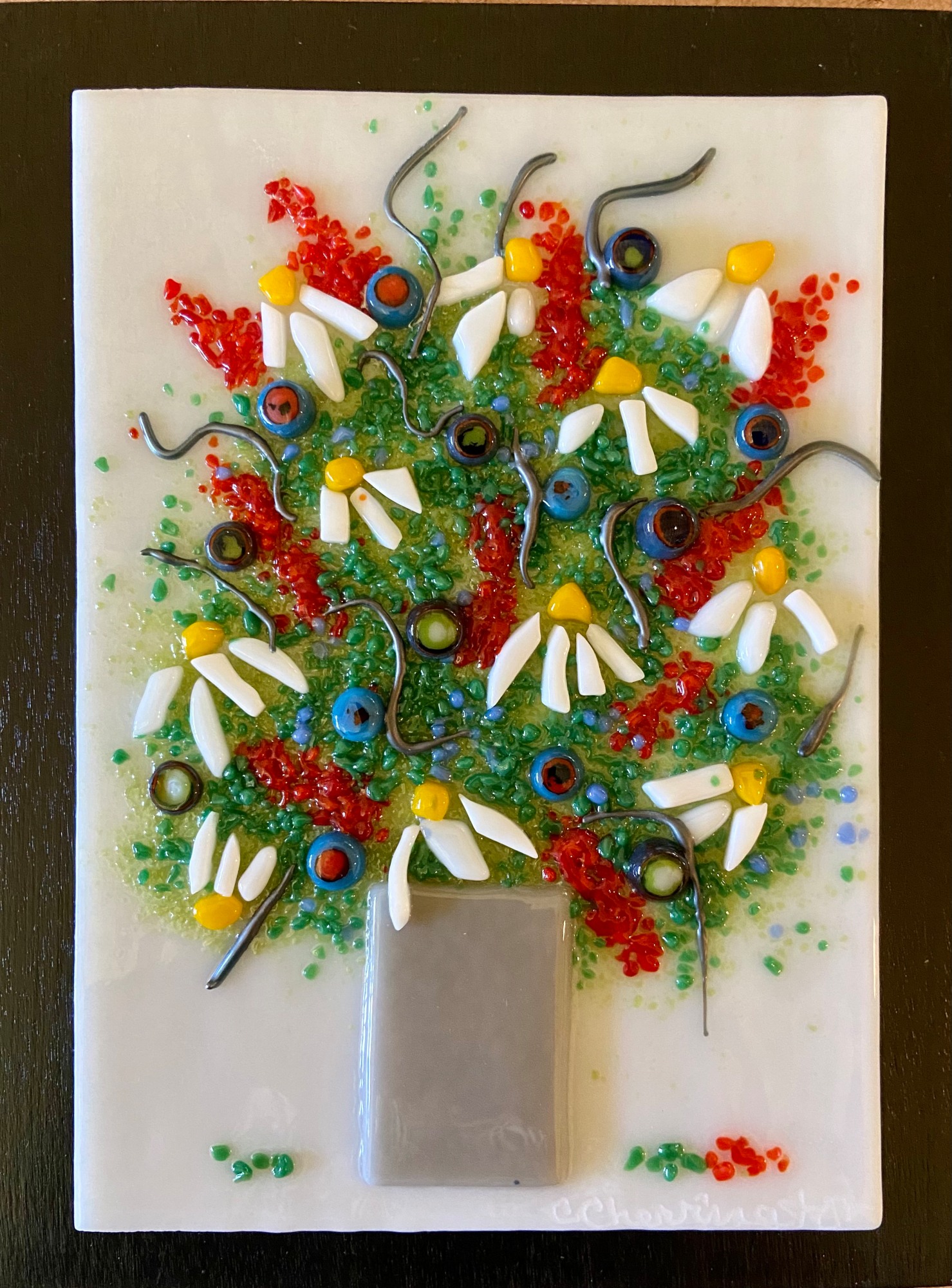 Glass bits arranged as flowers in a vase. Mounted on wood. Display hanging.