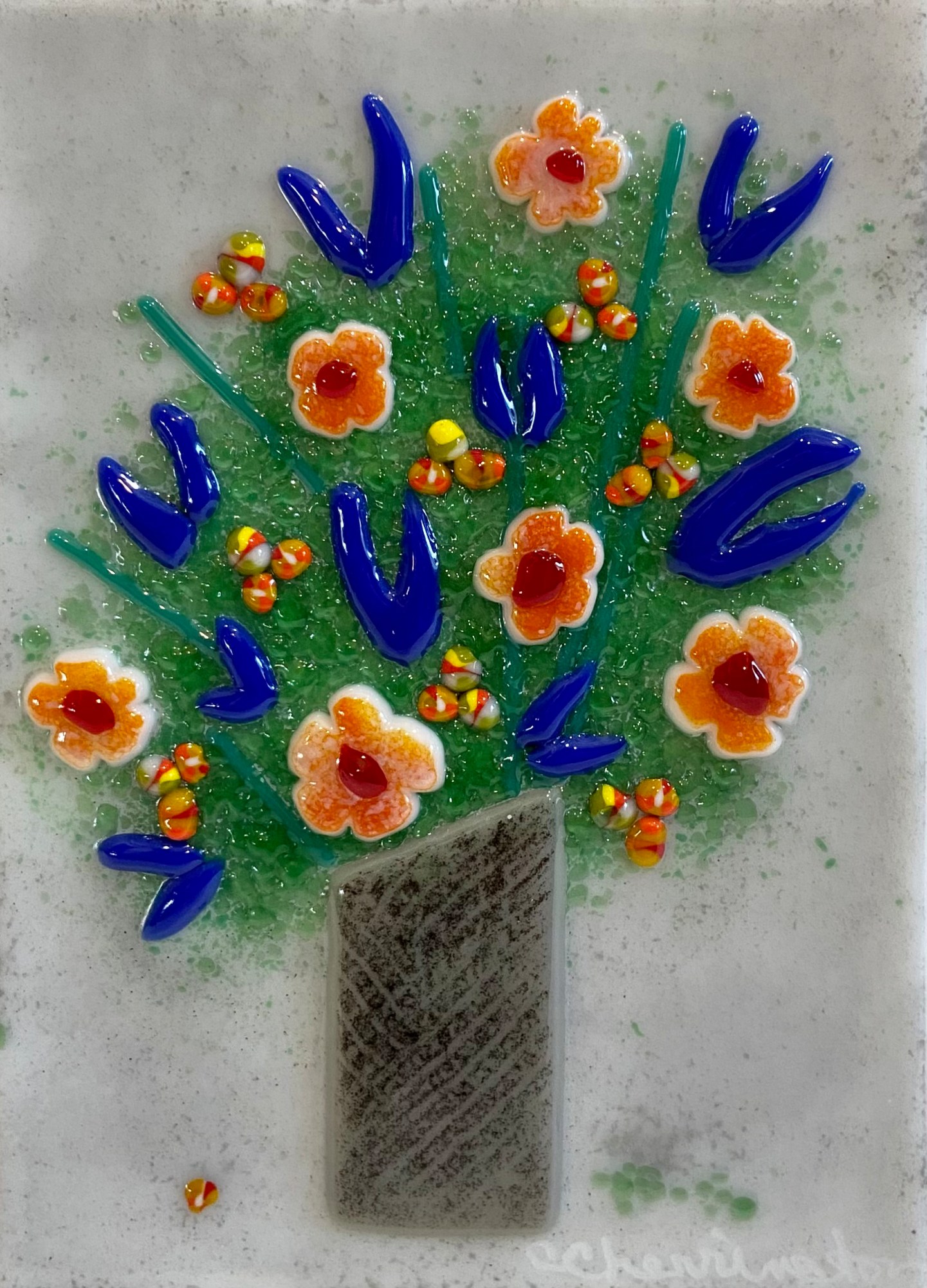 Glass bits arranged as flowers in a vase. Mounted on wood. Display hanging.