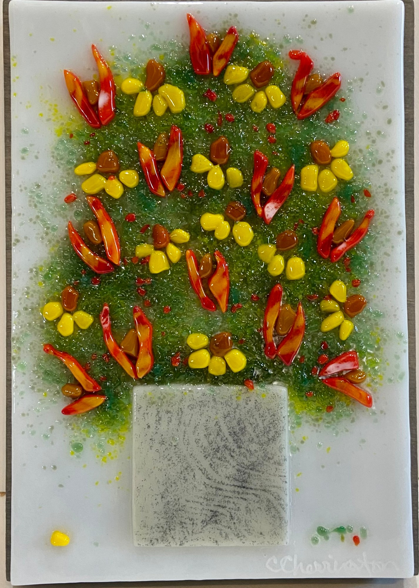 Glass bits arranged as flowers in a vase. Mounted on wood. Display hanging.
