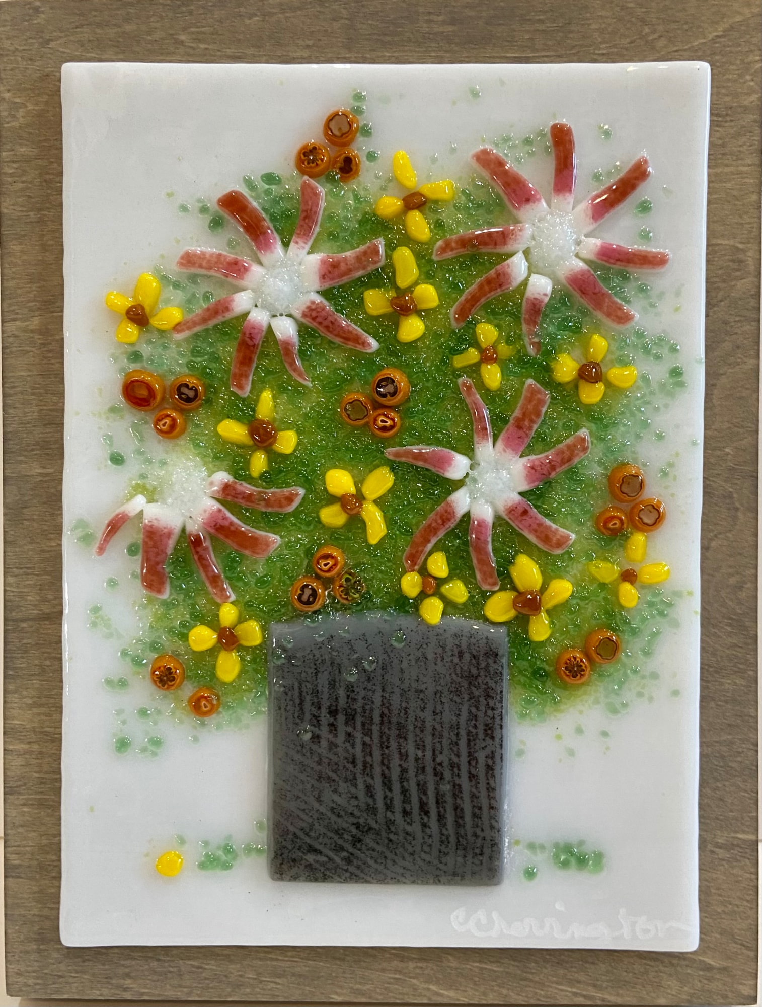 Glass bits arranged as flowers in a vase. Mounted on wood. Display hanging.
