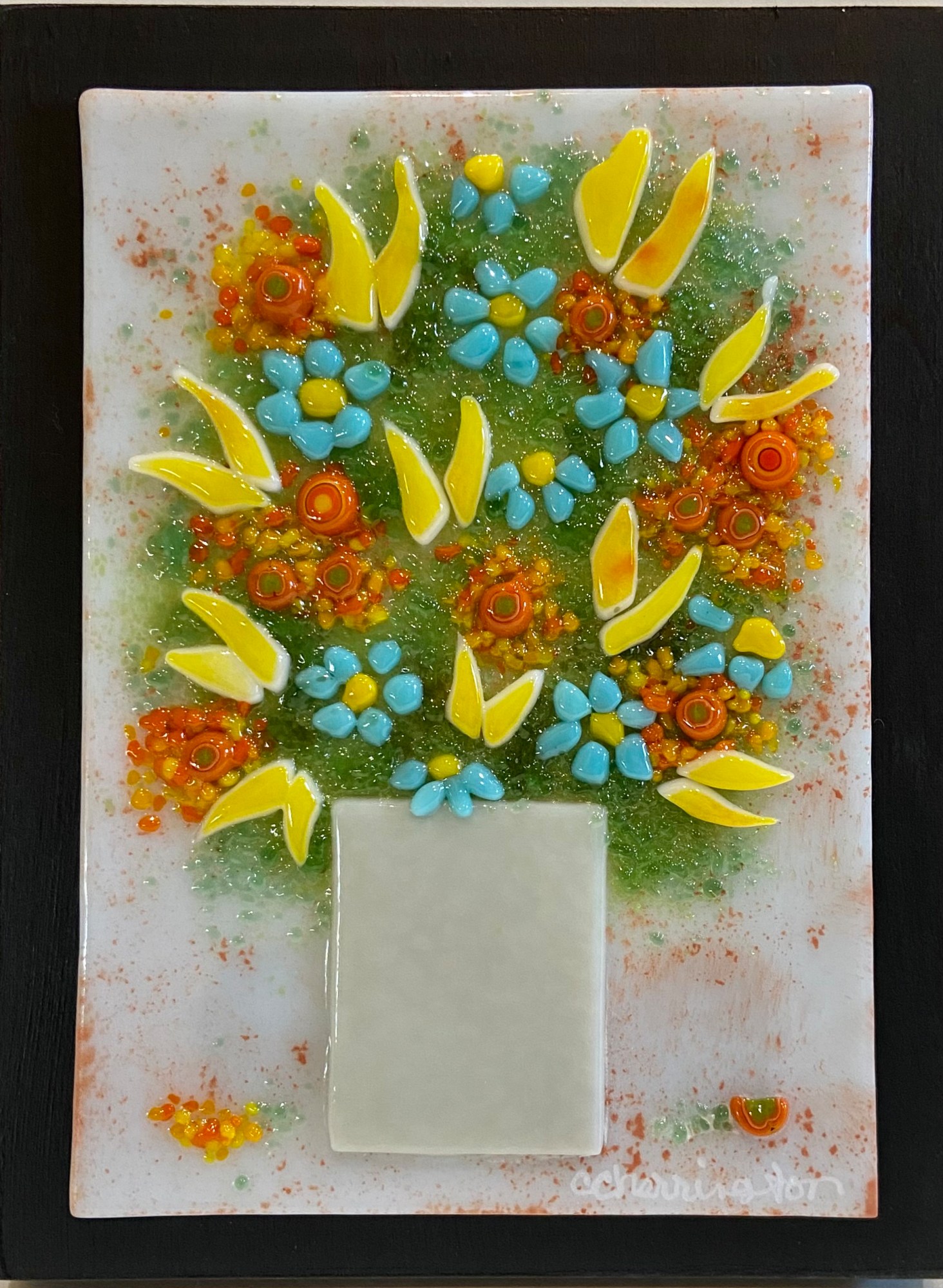 Glass bits arranged as flowers in a vase. Mounted on wood. Display hanging.
