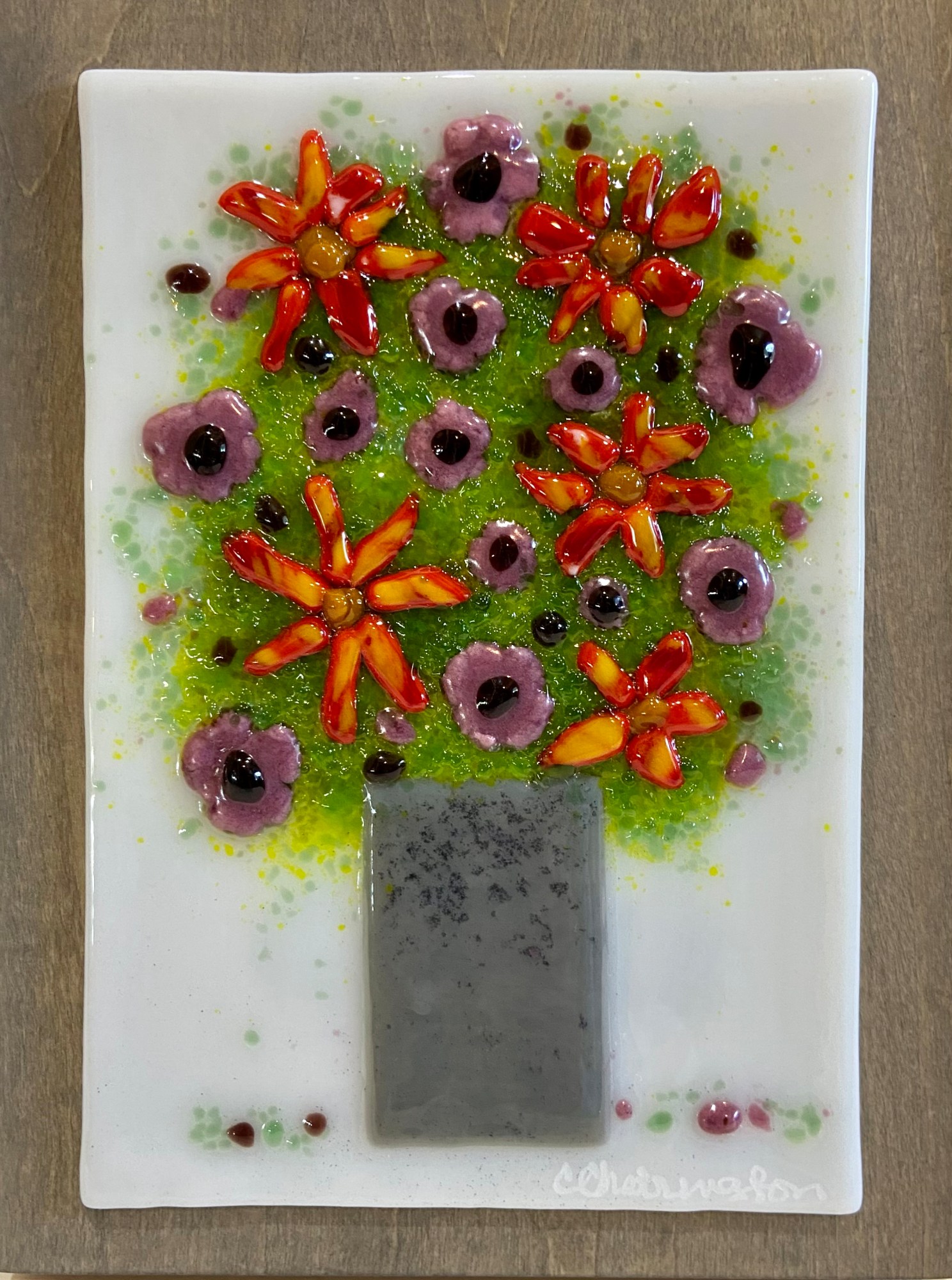 Glass bits arranged as flowers in a vase. Mounted on wood. Display hanging.