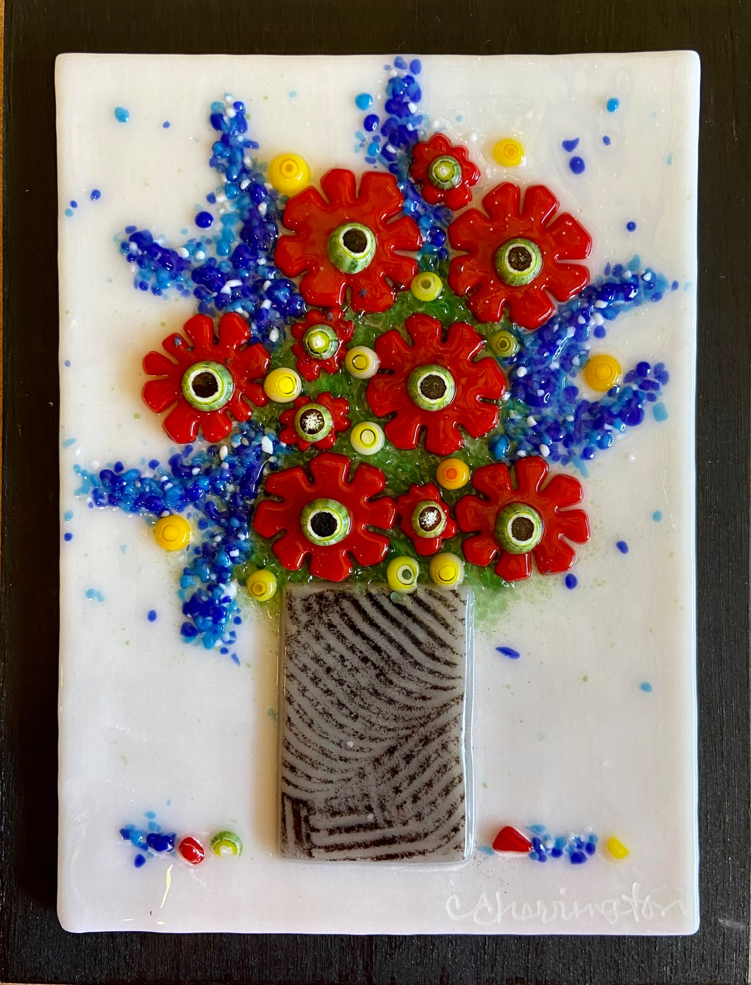 Beautiful flower blooms arranged in a vase. Mounted on a painted black board and ready to hang.