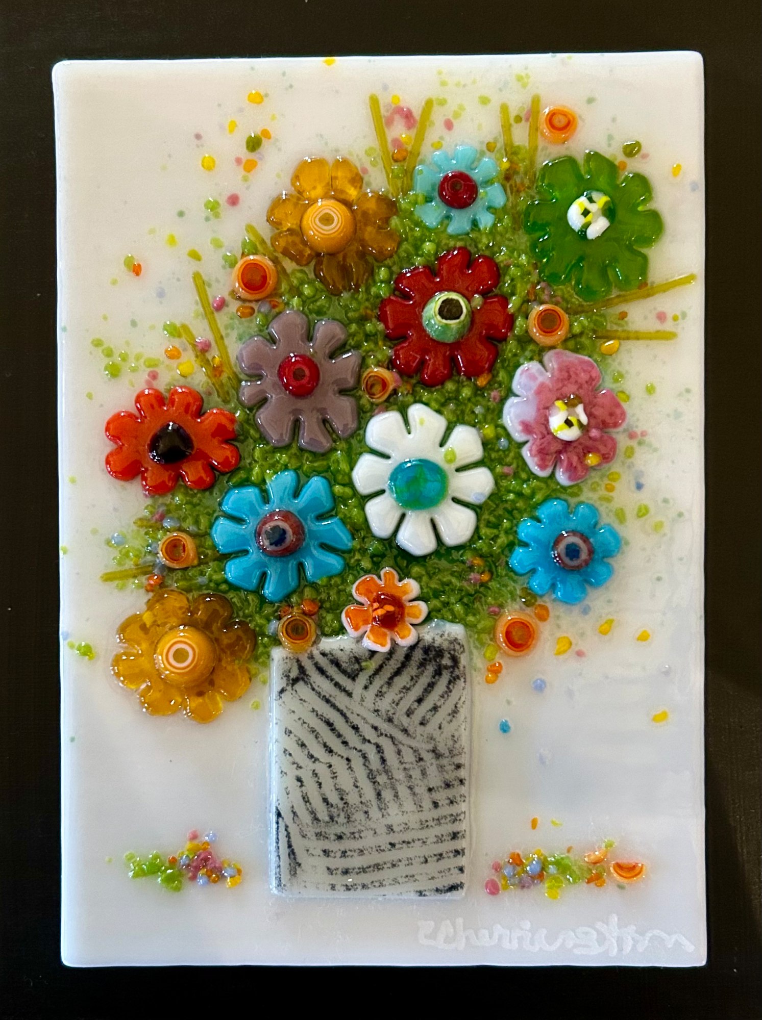 A bouquet of flowers. Mounted on a painted black board and ready to hang.