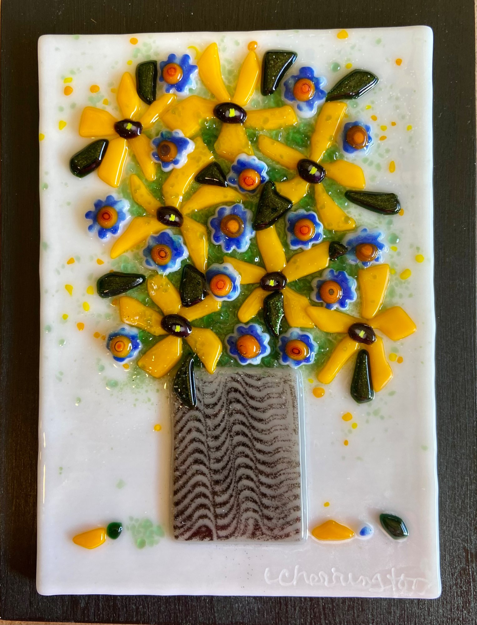 Beautiful flower blooms arranged in a vase. Mounted on a painted black board and ready to hang.