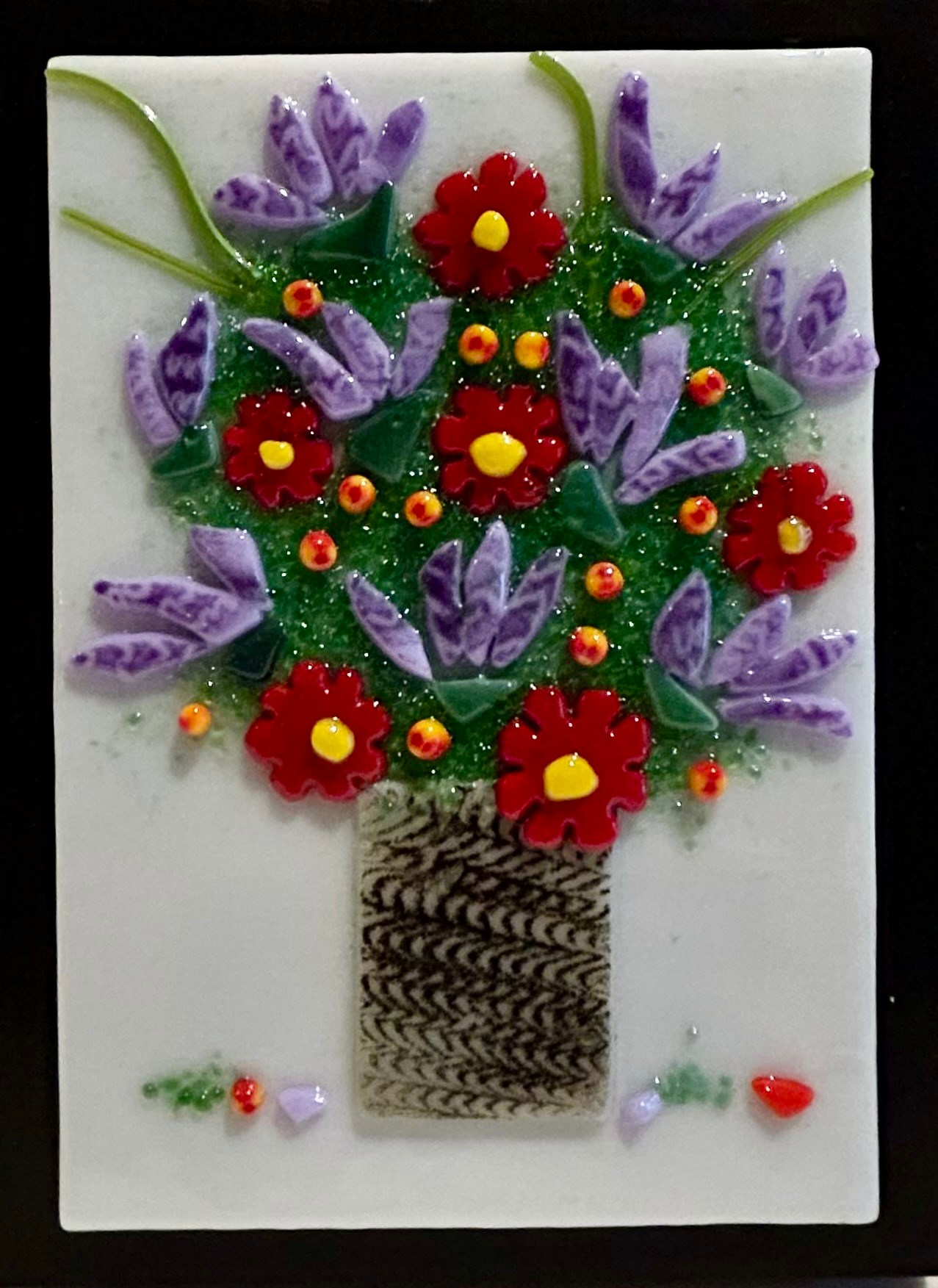 A lovely bouquet of glass flowers displayed in a container.