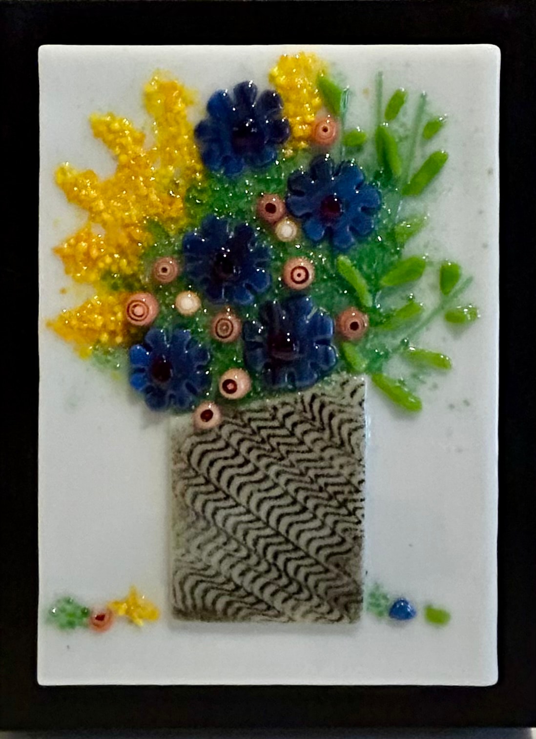 A lovely bouquet of glass flowers displayed in a container.