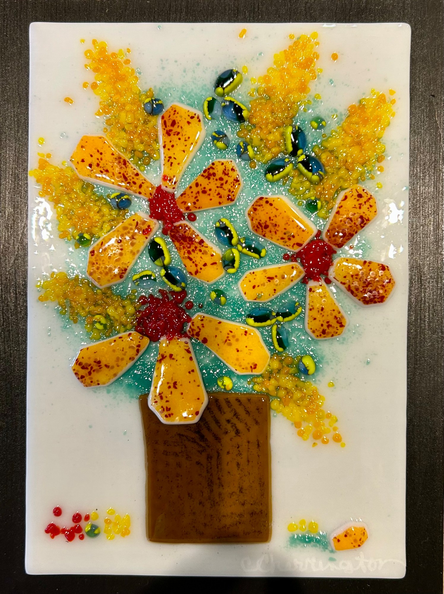 Beautiful flower blooms arranged in a vase. Mounted on a painted black board and ready to hang.