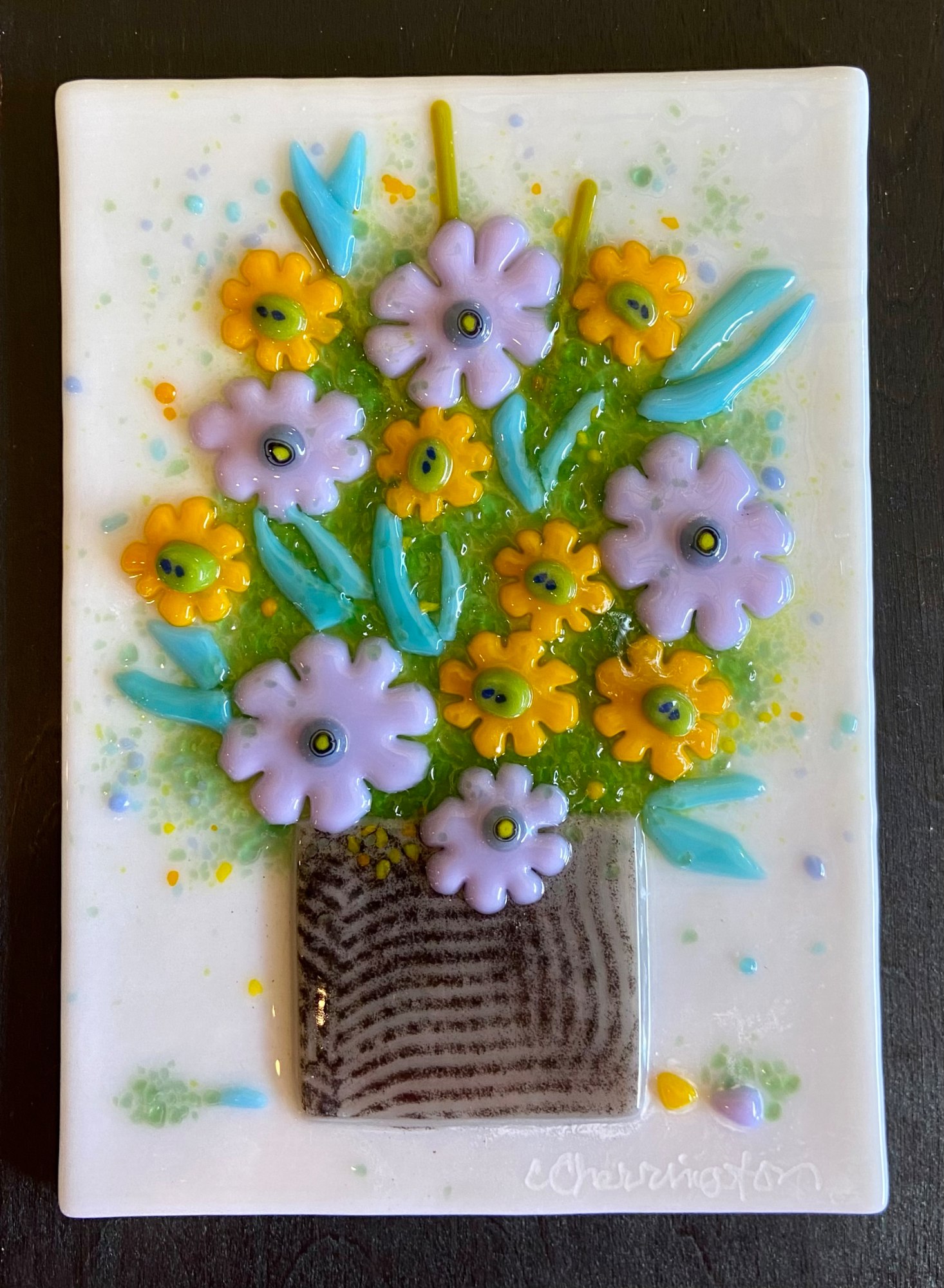 Beautiful flower blooms arranged in a vase. Mounted on a painted black board and ready to hang.