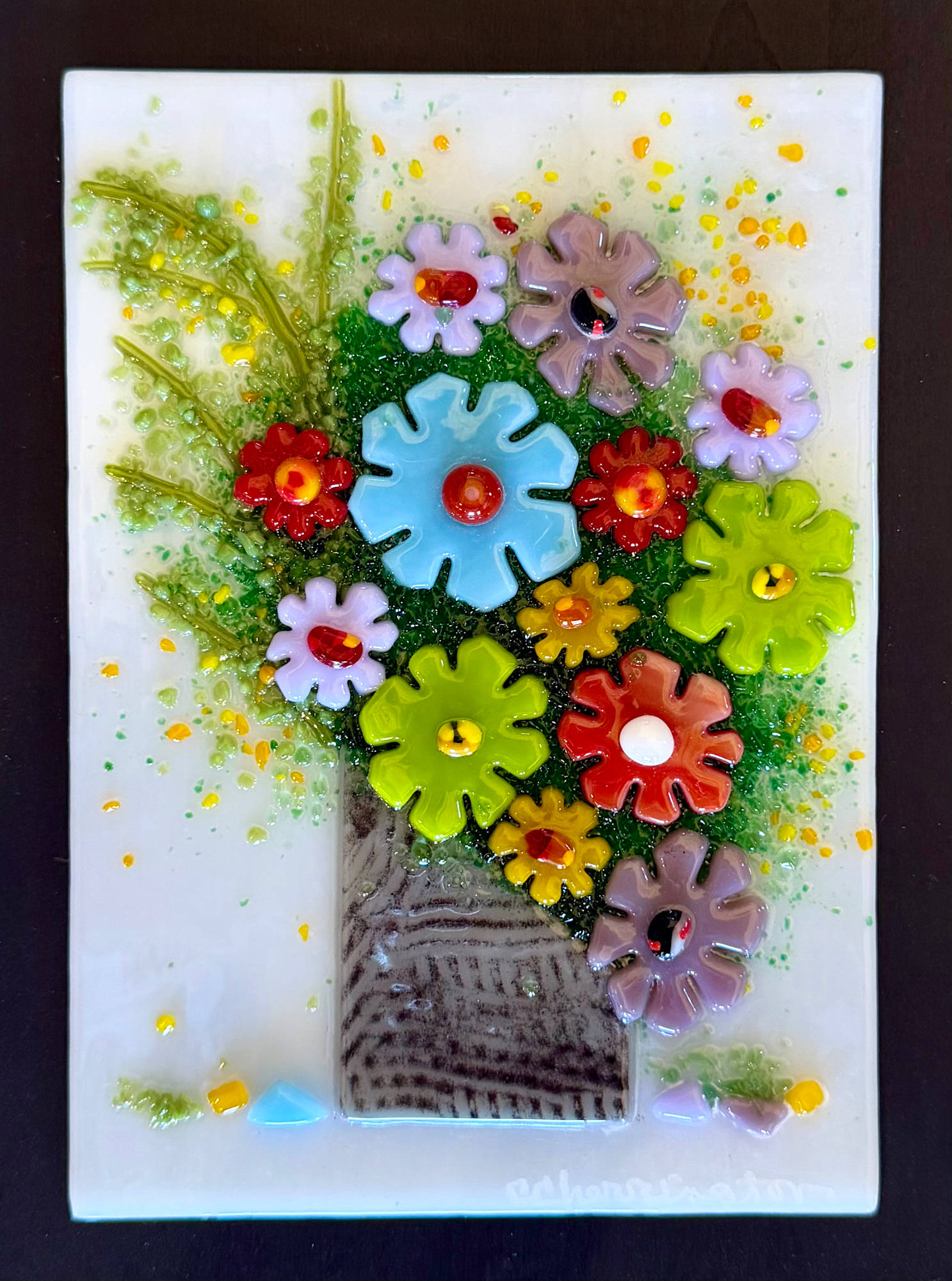 Flowers that last forever are colorful and cheerful. Mounted on a painted panel.