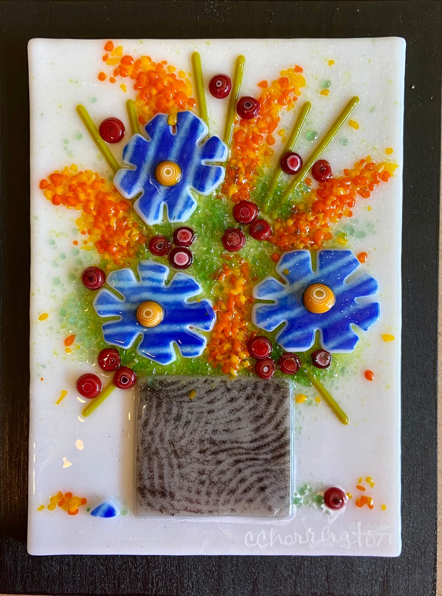 Beautiful flower blooms arranged in a vase. Mounted on a painted black board and ready to hang.
