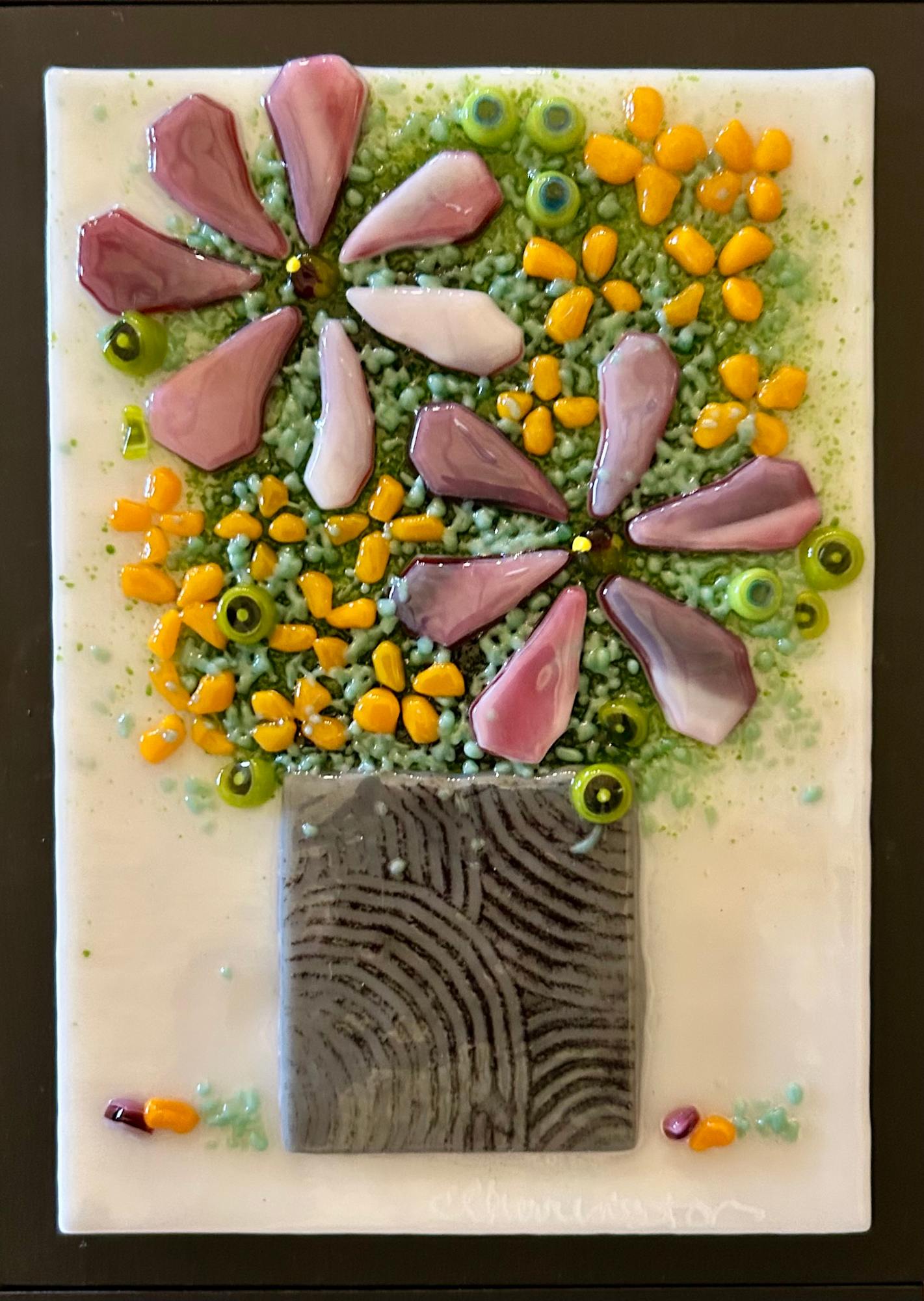 Nothing is better than an arrangement of flowers and these will never die. Mounted on a black panel and ready to hang.