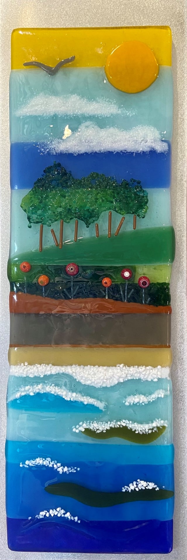 Transparent and opaque glass stacked on each other create this tall totem that represents a summer's day at the water.. Mounted on brushed aluminum ready to hang.