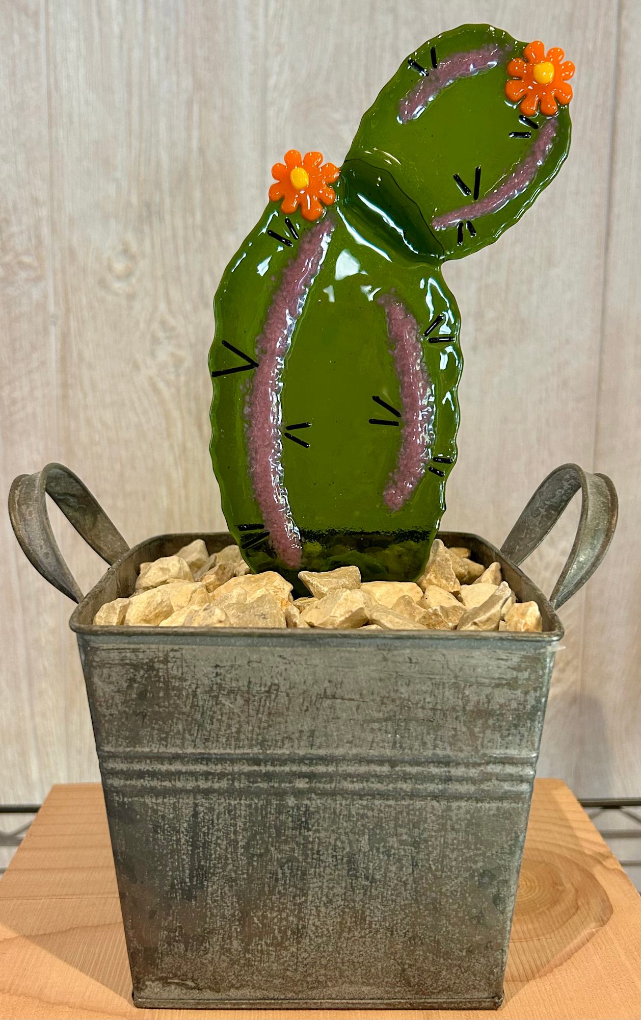 One green cactus in a square handled rustic metal planter surrounded by white rocks. Size is approximate and may vary.