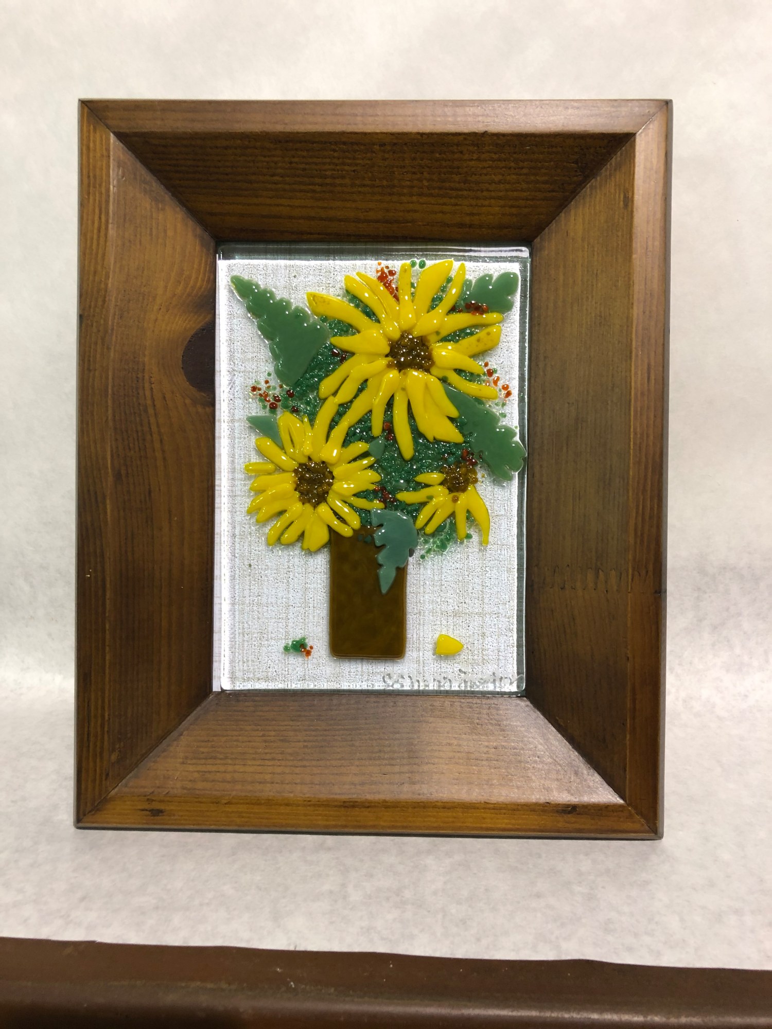 Glass bits arranged as flowers in a vase. Mounted in wood frame. Display table top or hang.