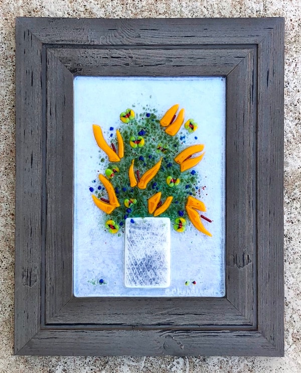 Glass bits arranged as flowers in a vase. Mounted in wood frame. Display table top or hanging.