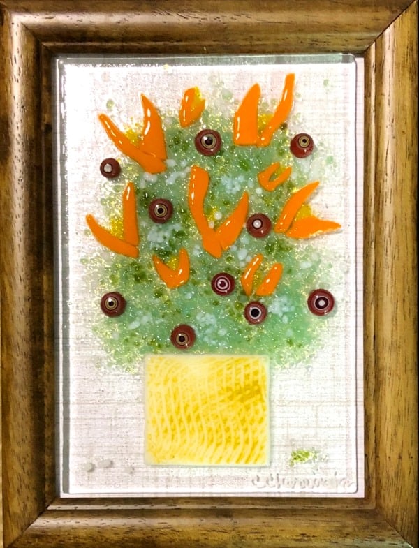Glass bits arranged as flowers in a vase. Mounted in wood frame. Display table top or hanging.