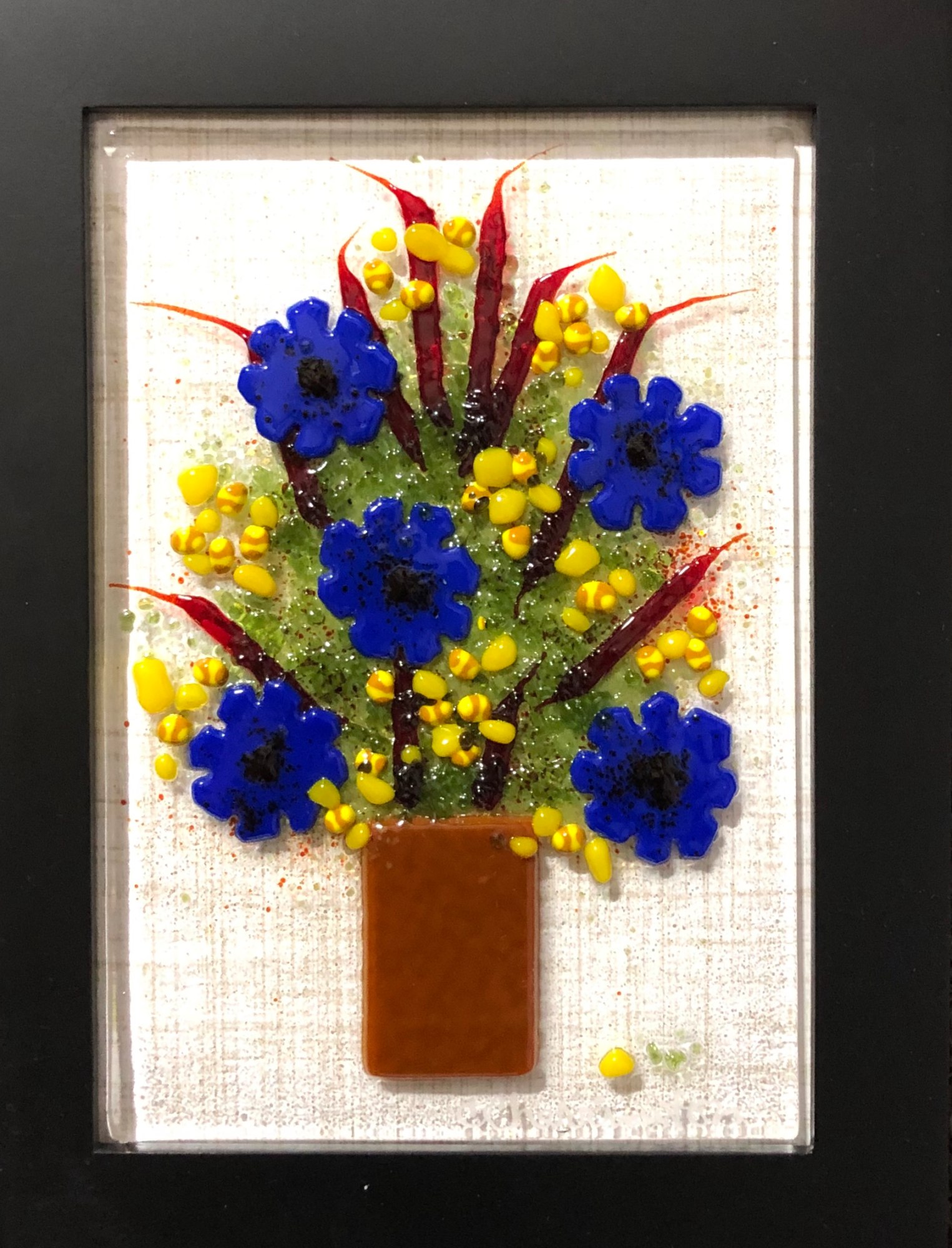 Glass bits arranged as flowers in a vase. Mounted in wood frame. Display table top or hanging.